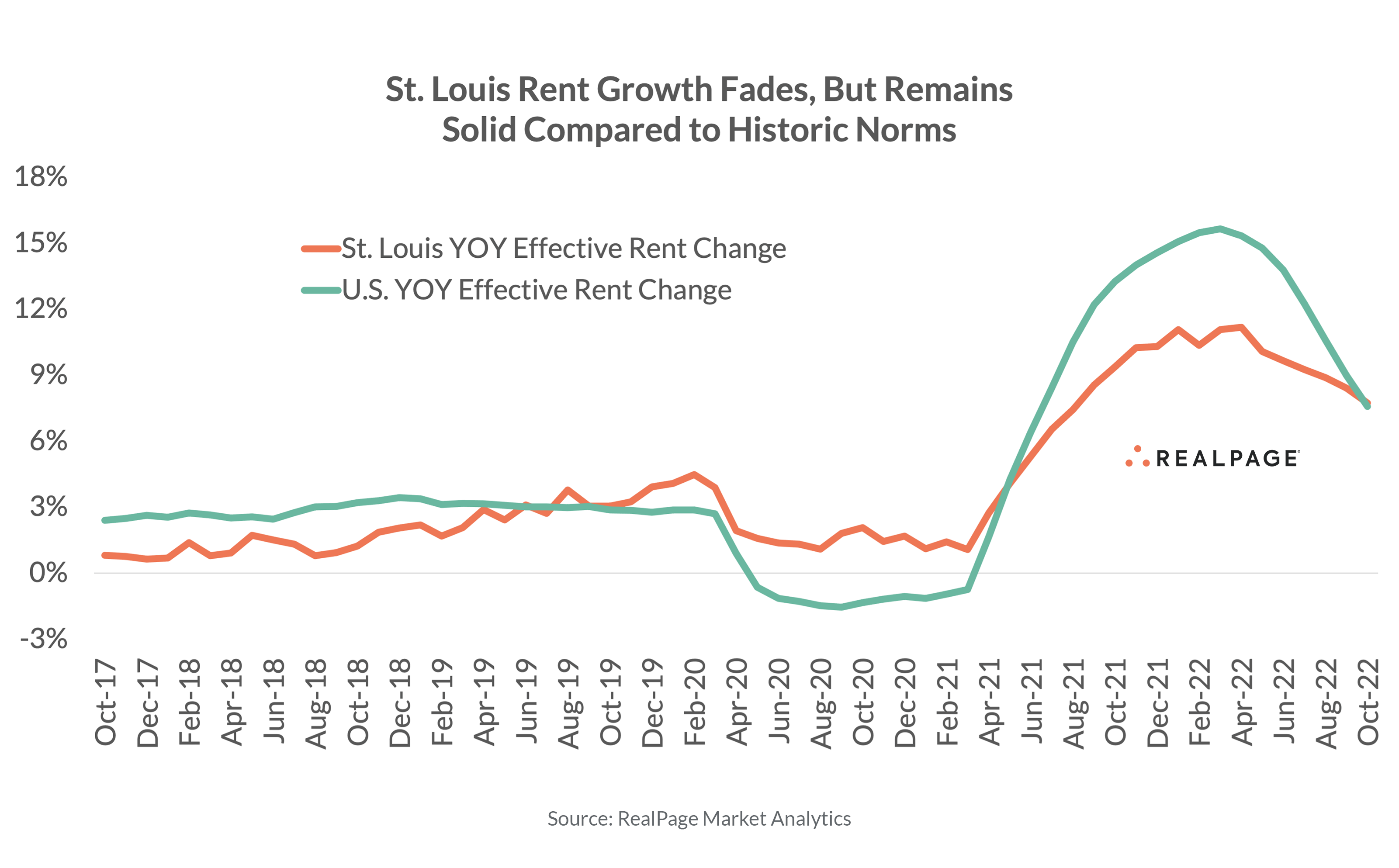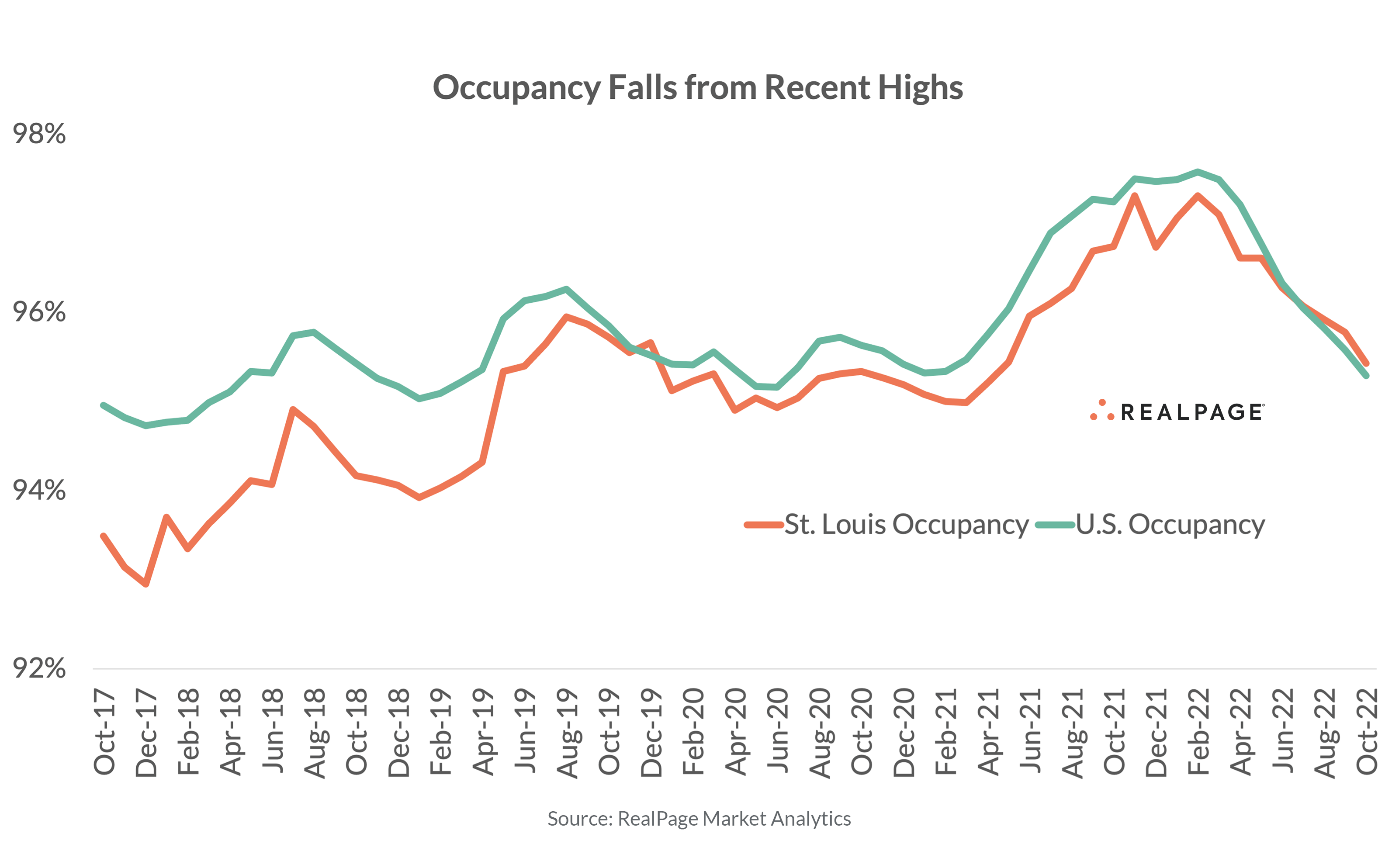 Occupancy in St. Louis has been coming down since peaking at over 97% in February 2022 but remains healthy compared to historical norms. As of October, occupancy here had fallen to 95.4%, a bit ahead of the market’s five-year average and right in line with the U.S. norm.