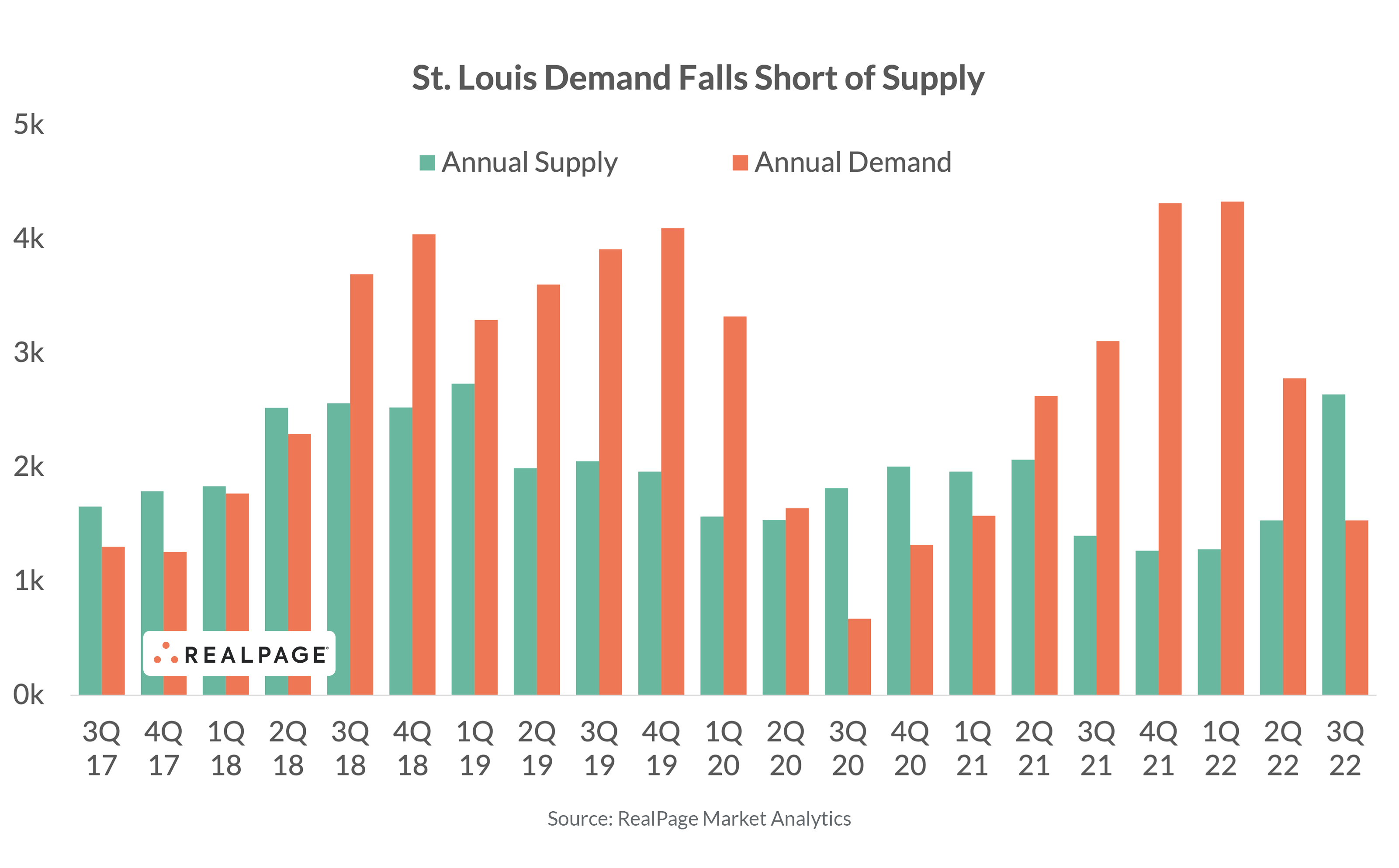 Just like what was seen across much of the nation, demand faded in St. Louis in 3rd quarter 2022. However, this typically stable Midwestern market maintained positive absorption in the July to September time frame, logging demand for just 171 units. While not spectacular, the fact this market absorbed anything when many markets suffered net move-outs is significant. Thus, St. Louis managed to hold onto annual net absorption of 1,534 units.