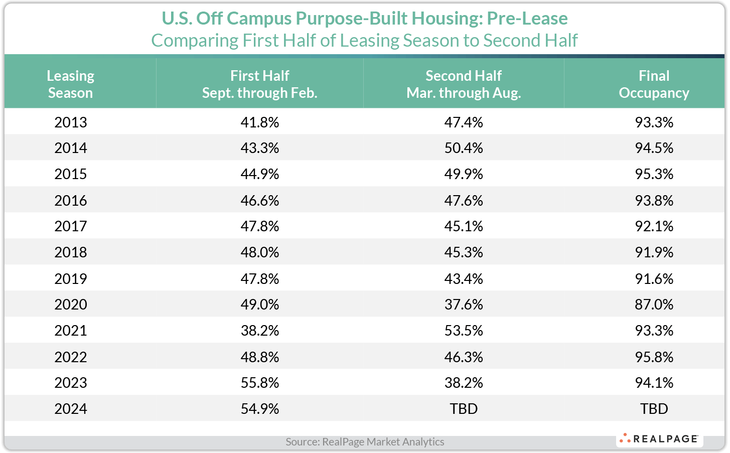 Student housing momentum in the first half of the pre-lease season has gotten considerably stronger in the last couple years. While the second half of the season is expected to be more mild, look for the market to end Fall 2024 in solid shape.