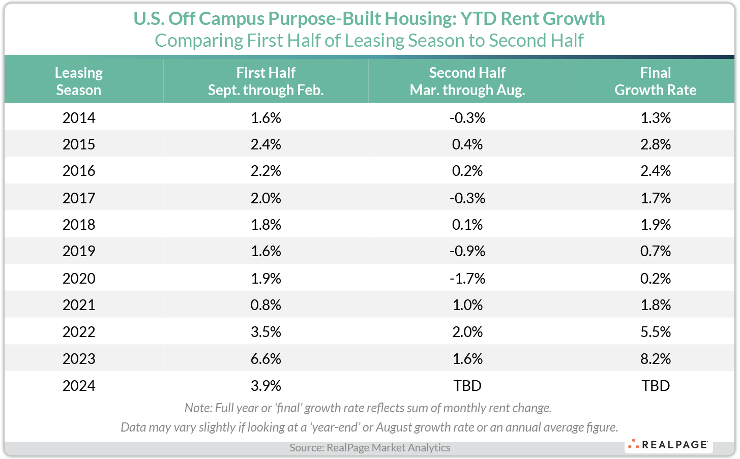 Student housing rent growth in the past few years has also acted out of character. In general, price setting tends to be harder in the second half of the pre-lease season. But in 2021 through 2023, while the typical moderation did occur, the second half of the season still saw rent growth of about 1% to 2%. Prior to 2021, rent cuts were the norm in the second half of the season, averaging a slight decline of 0.4%.