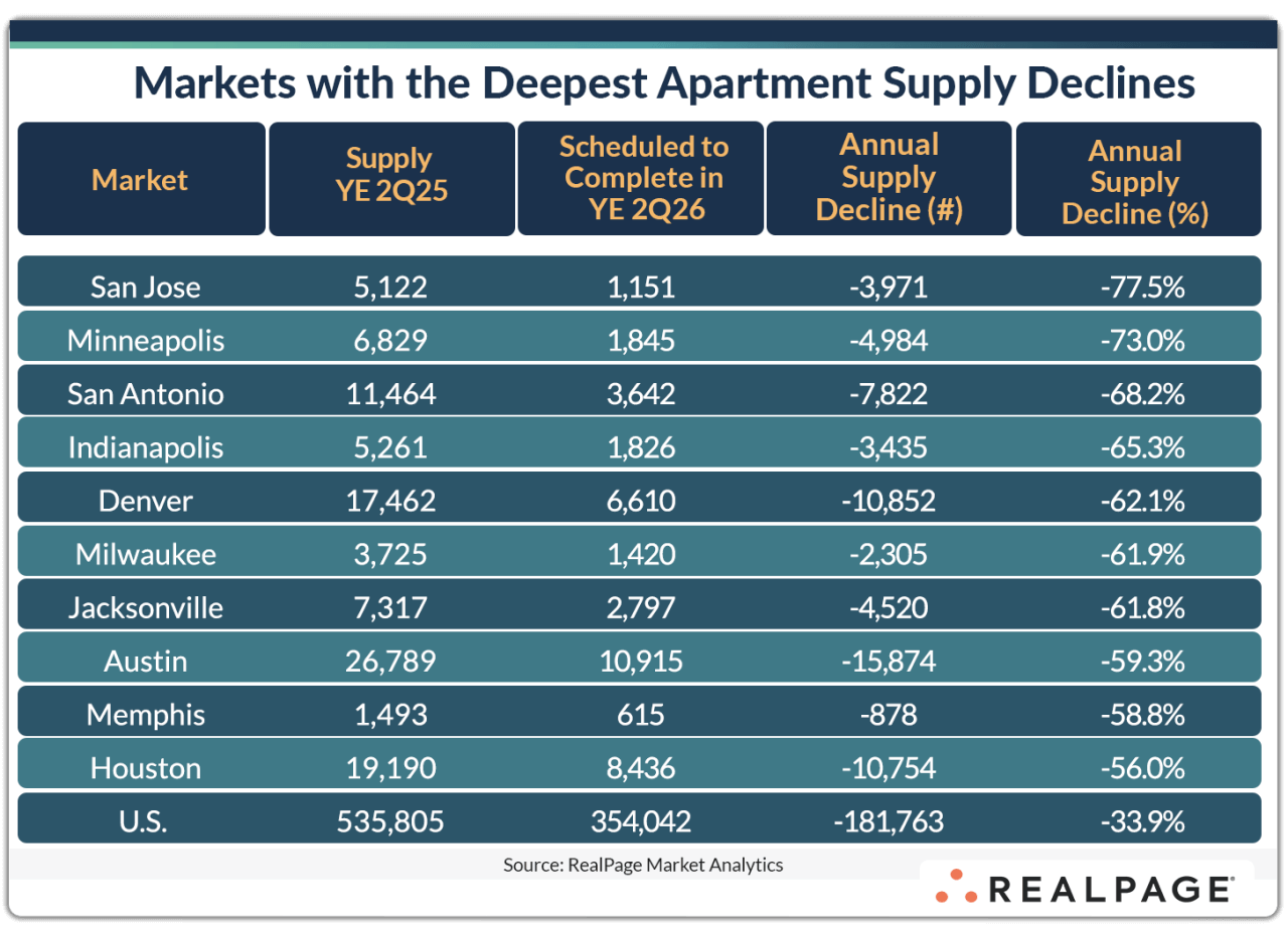 As supply volumes drop across the U.S., some individual apartment markets are logging pronounced declines.