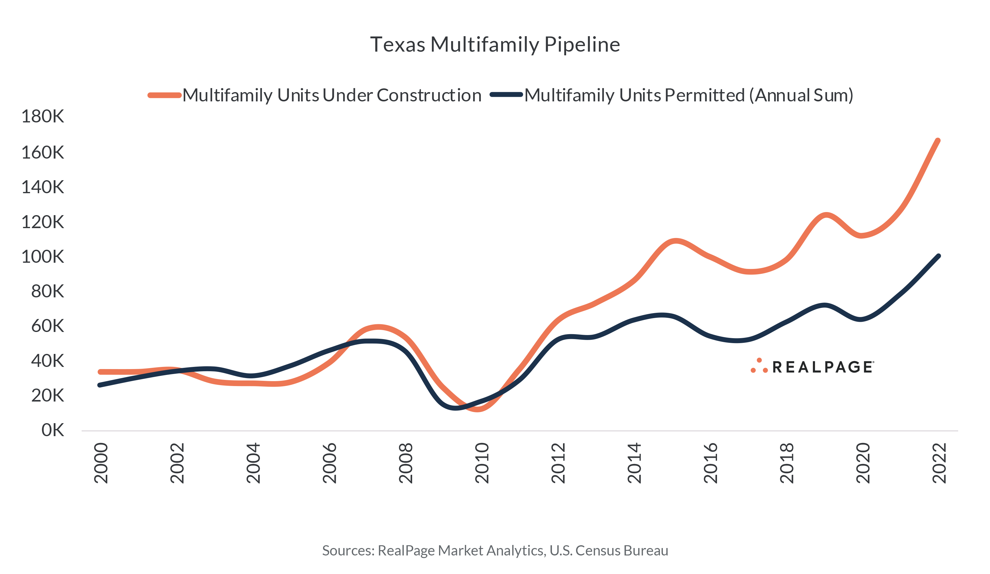 While Texas apartment construction activity generally runs above national averages, the multifamily building pipeline in the state is now bigger than it has ever been. At the end of 2022, nearly 170,000 market-rate apartments were under construction across the Lone Star State. That was an all-time high for Texas and topped the state’s 2020 level by 55,000 units. As is usual, construction in Texas is concentrated across a few major markets. Dallas-Fort Worth remains the nation’s apartment construction leader, as it has been for a while, boasting 65,000 units under construction. Austin, which has seen a significant building boom in recent years, has 42,000 apartments currently under construction and saw another 22,000 units permitted in the past year.