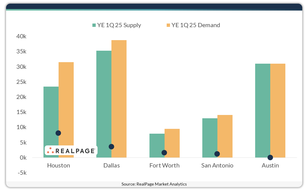 Some of Texas’s biggest apartment markets have been national leaders for both supply and demand in recent years. Among them, Houston has seen the most net demand (demand less concurrent supply). Dallas, Houston and Austin ranked among the nation’s top five markets for demand in the year-ending 1st quarter, joined by New York and Phoenix, according to data from RealPage Market Analytics. Dallas, Austin and Houston also ranked among the top five national markets for apartment supply in the past year, joined by Phoenix and Atlanta. Houston, however, was the only Texas market to rank among the nation’s top five for demand surplus in the last year. Annual absorption in Houston topped concurrent supply by 8,034 units in the year-ending 1st quarter. Only New York saw a bigger net demand volume. Los Angeles, Washington, DC and Chicago also ranked among the top five. Dallas just missed out on a top five performance, with demand topping supply by 3,500 units. Austin was the only large Texas apartment market to see demand come in below supply, but the gap was negligible at only about 50 units.