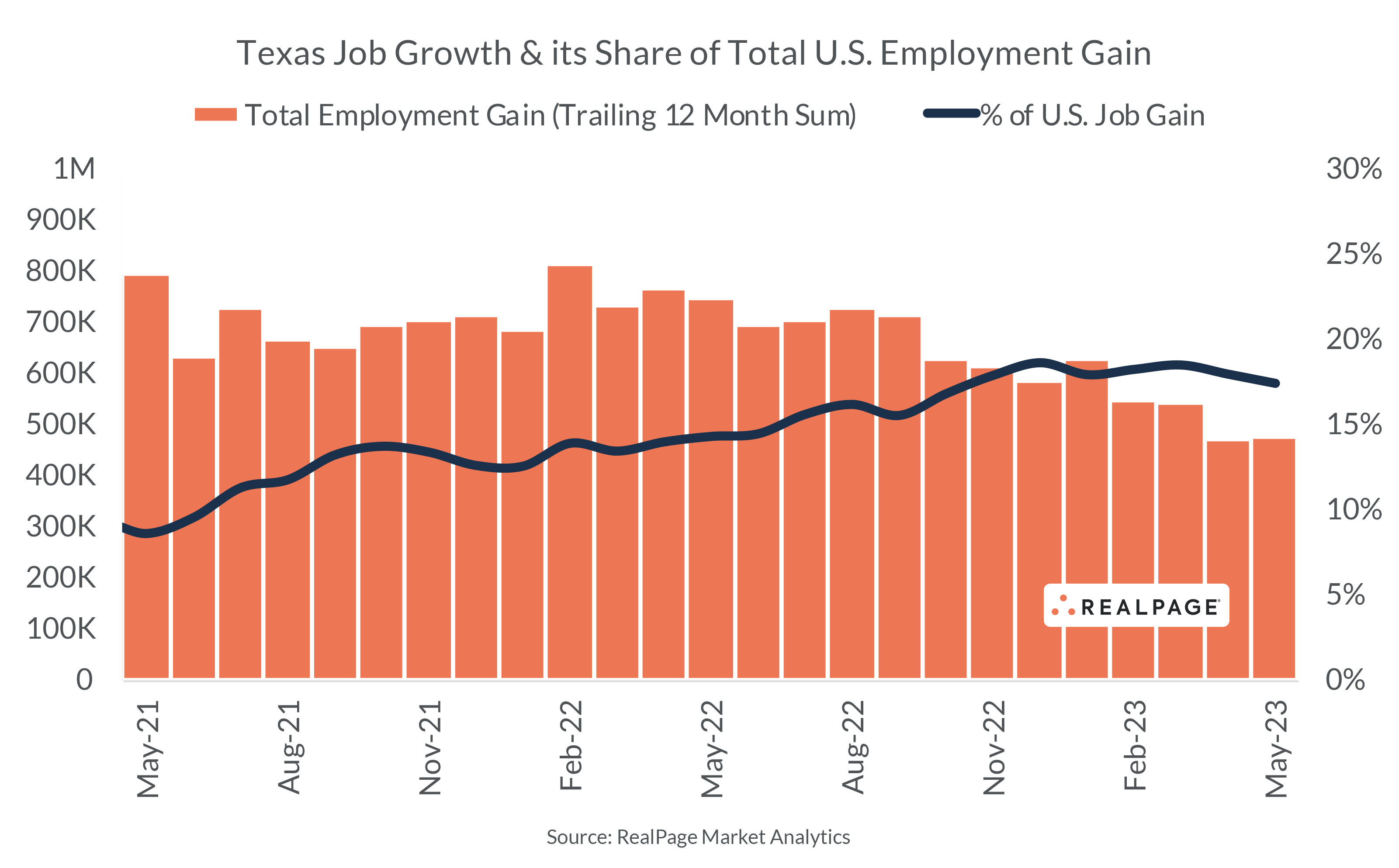 Despite recent declines, Texas job growth numbers remain strong on a national scale. In year-ending May 2023, Texas markets added some 474,000 additional jobs, according to data from the Bureau of Labor Statistics. That makes up a significant 17.5% share of the nation’s total employment growth for the past 12 months. The share of market value Texas has gained in the past two years is notable. Back to 2021, the Texas share of U.S. job growth was much lower at 8.6%. While Texas job growth has slowed – just a year ago, annual employment growth was closer to 700,000 jobs – that contraction is a natural product of tight unemployment rates. Roughly 4.1% of all Texas were unemployed as of May 2023. When widening the scope, however, the major markets across the Lone Star State are holding on to better job gain traction than many other markets across the U.S. Dallas and Houston are among the top three job growth markets in the U.S. as of May, while San Antonio, Austin and Fort Worth all rank among the nation’s top 15.