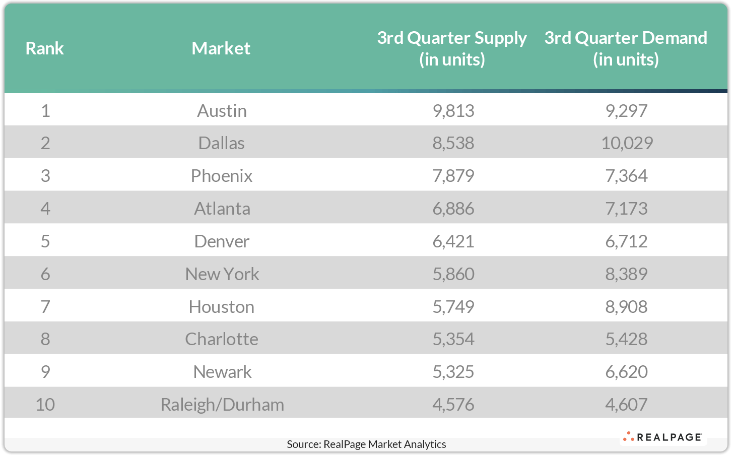 Of the more than 160,000 apartments delivered across the U.S. in 2024’s 3rd quarter, roughly 15% completed in Texas markets. Austin was the nation’s apartment supply leader, with over 9,800 units wrapping up in the July to September time frame, according to data from RealPage Market Analytics. Dallas delivered the second highest total deliveries, with about 8,500 units completing in the quarter. Houston supply was a bit more muted – comparatively – at 5,750 units, but that was still one of the top deliveries nationwide. Three other South region markets made the top 10, including Atlanta, Charlotte and Raliegh/Durham. That brought total deliveries in the South to over 40,900 units in 3rd quarter. That’s nearly three times more than the totals in the West (14,300 units) and Northeast (11,185 units) regions. No Midwest markets made the top 10 list. In fact, even the Midwest leader – Minneapolis – added moderate supply of a little over 2,000 apartments in 3rd quarter.