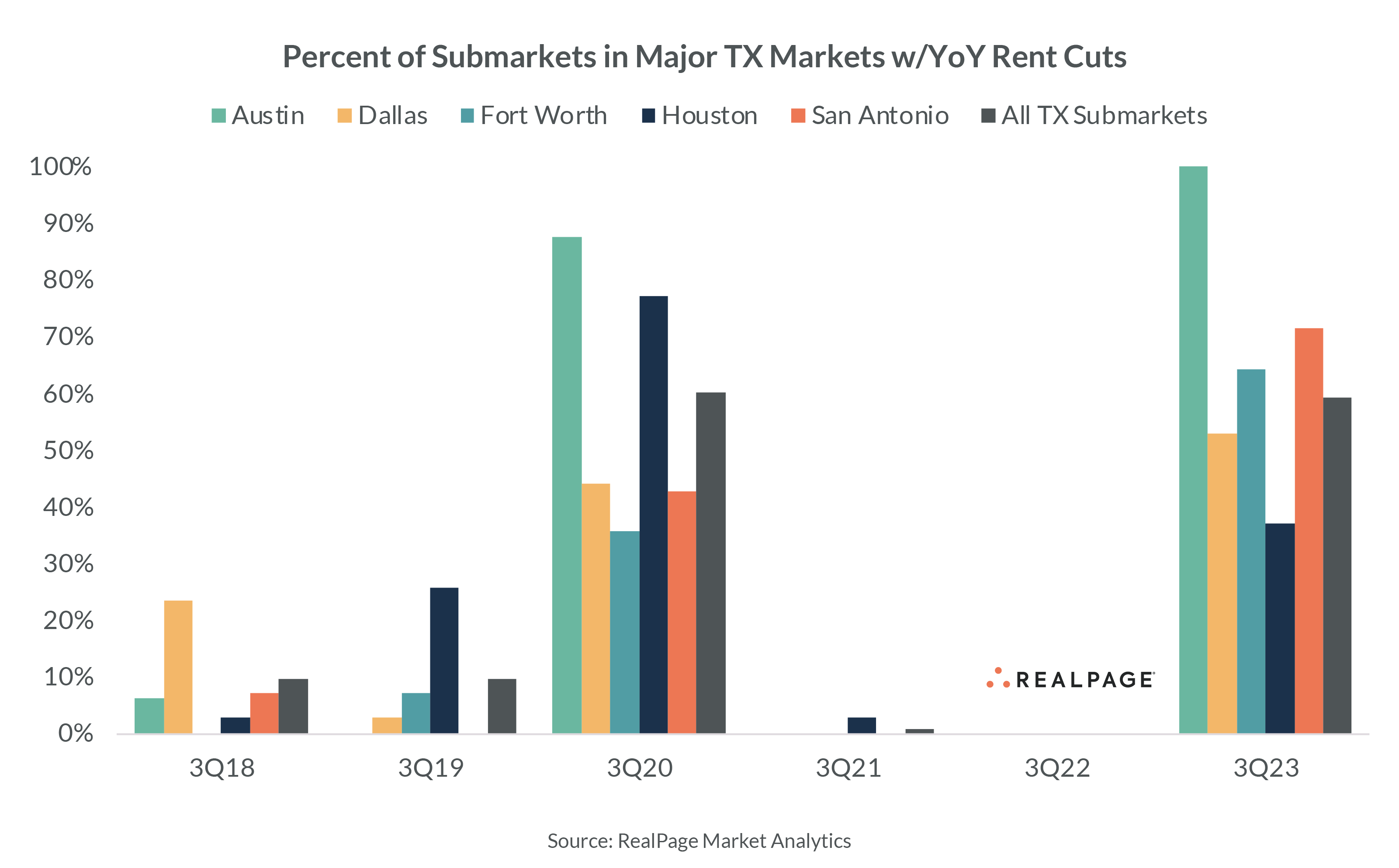 Despite strong apartment demand in many Texas submarkets, rent cuts are becoming more common. In fact, 60% of all Texas submarkets logged rent cuts in the year-ending 3rd quarter. While this is a trend happening all over the U.S., Texas submarkets are especially impacted, given the high volumes of new supply delivered in the Lone Star State in recent years. Austin, which has seen record new supply in the past five years, is especially prone to rent cuts. Every submarket across the state capital saw price declines year-over-year as of 3rd quarter, with some cuts getting as deep as 5% to 7%. In San Antonio, a little over 70% of submarkets are logging rent cuts, while Fort Worth is close with about 64%. The other half of the Metroplex, Dallas, is seeing price declines in about 53% of submarkets. Houston stands out as an exception among Texas markets. In contrast to previous cycles, Houston is experiencing fewer rent cuts due to limited supply, resulting in less downward pressure on rents. Less than 40% of Houston submarkets are logging rent cuts.
