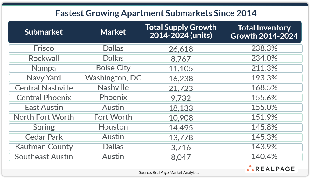 Two other Texas submarkets more than doubled their existing unit base between 2014 and 2024.