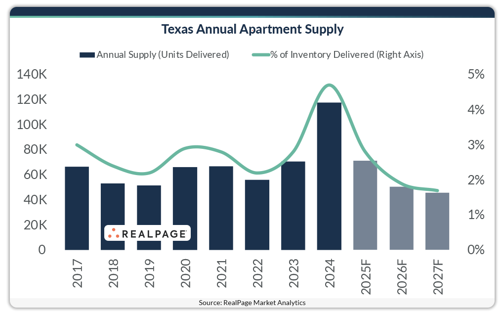 After dominating for new apartment supply volumes in 2024, Texas is now past its peak and delivery volumes are dropping off.