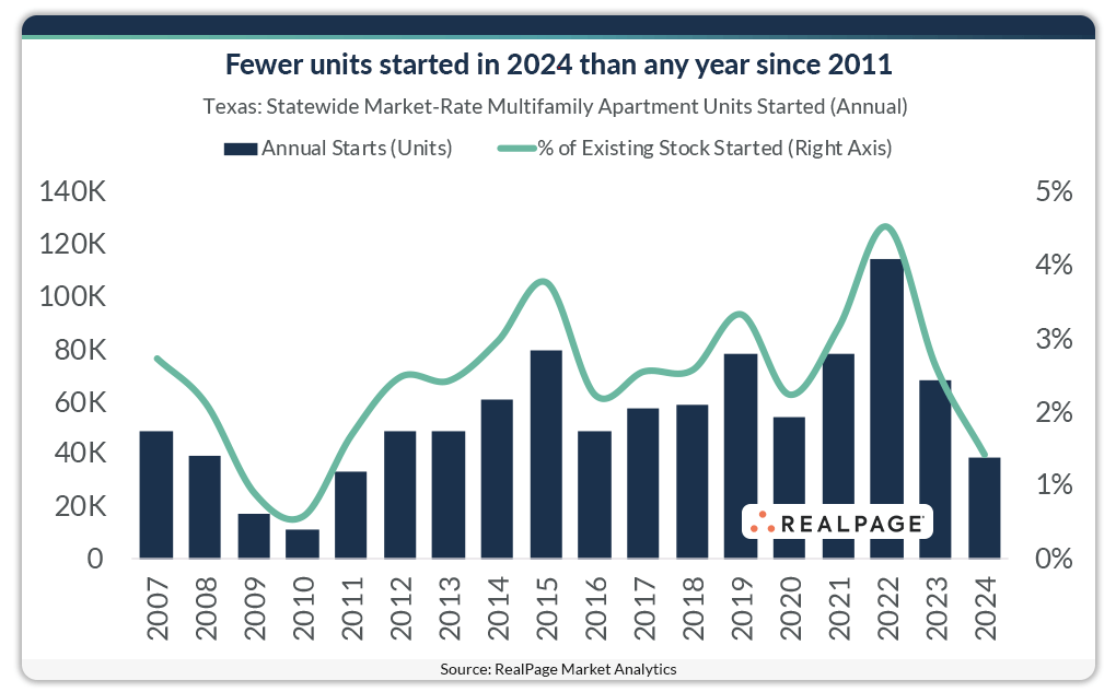 A precursor of supply, multifamily starts also declined notably in recent years in Texas. In calendar 2022, over 114,000 units got off the ground in Texas, a peak volume for the state. After that historic peak, starts dropped to 68,000 units in 2023 and declined even further to about 38,800 units in 2024. At least some of those starts delivered in 2024 and the remaining will most likely come online in 2025.
