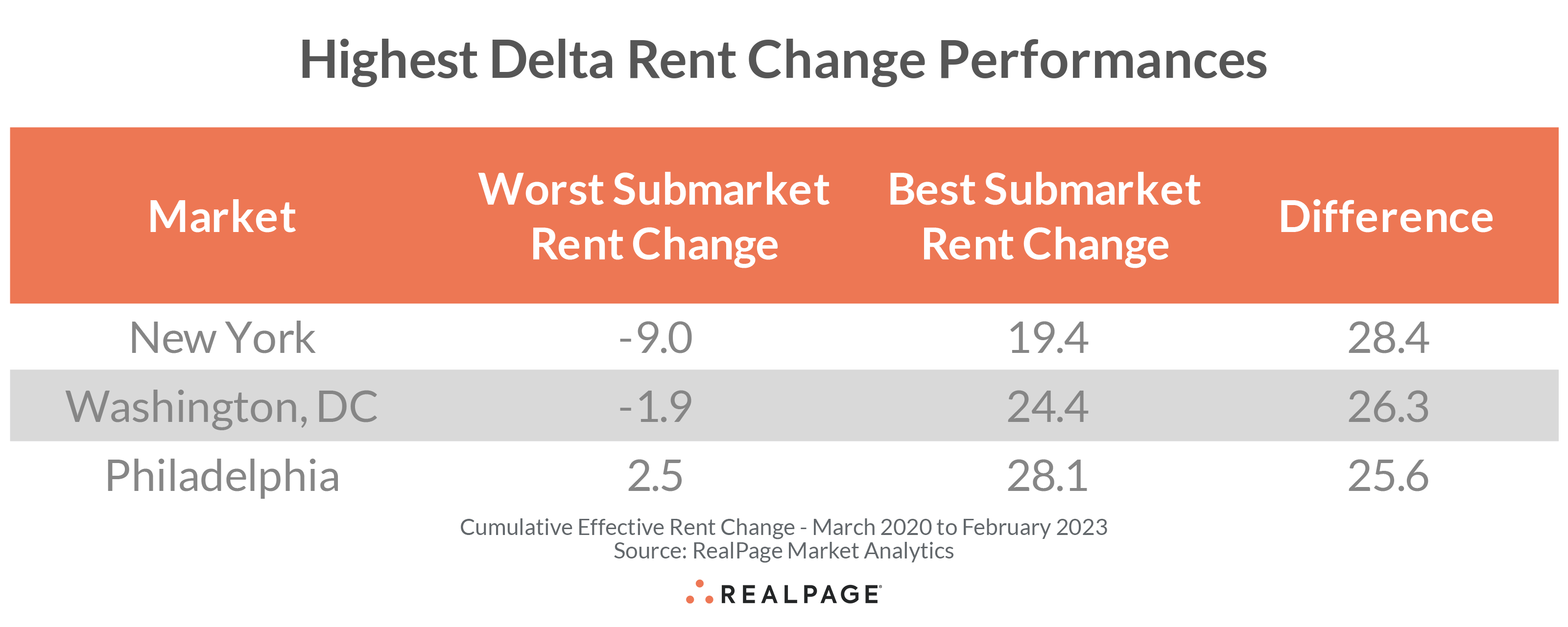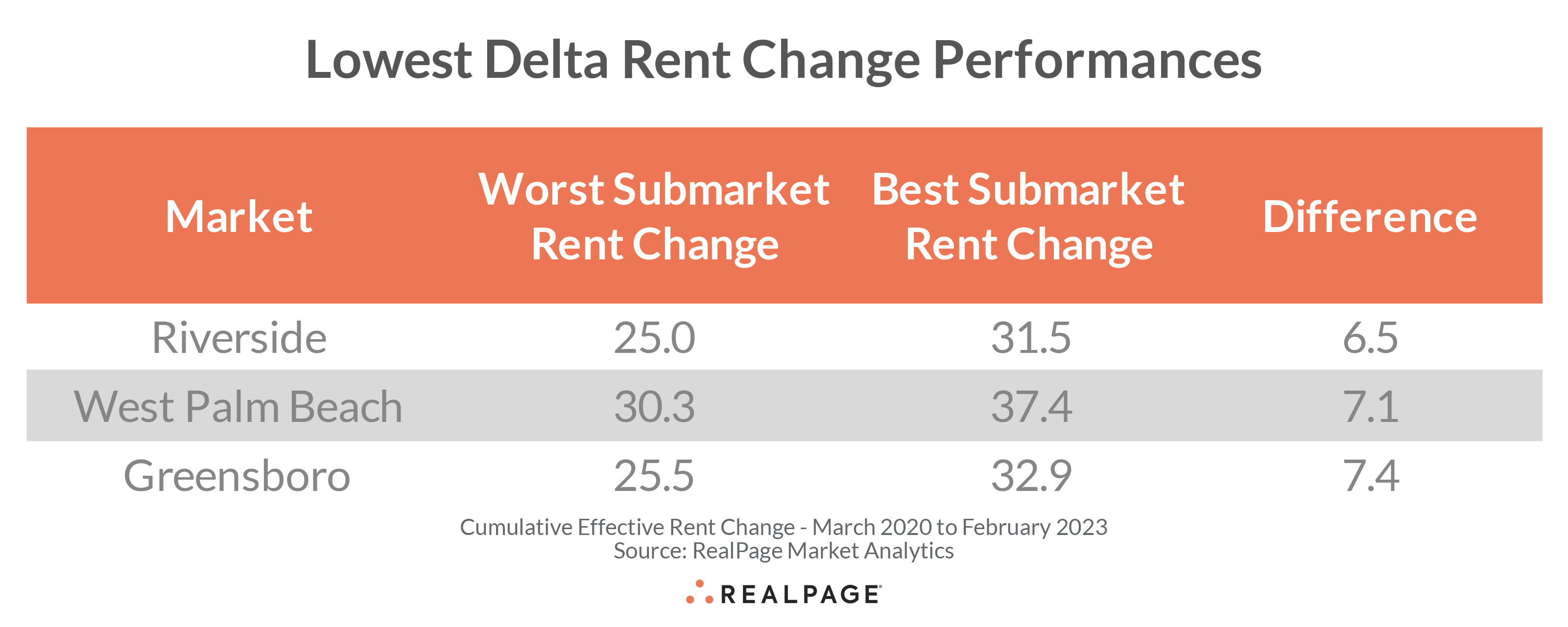 The smallest deltas in rent change performances were among submarkets in Riverside (6.5 points), West Palm Beach (7.1 points) and Greensboro/Winston-Salem (7.4 points).