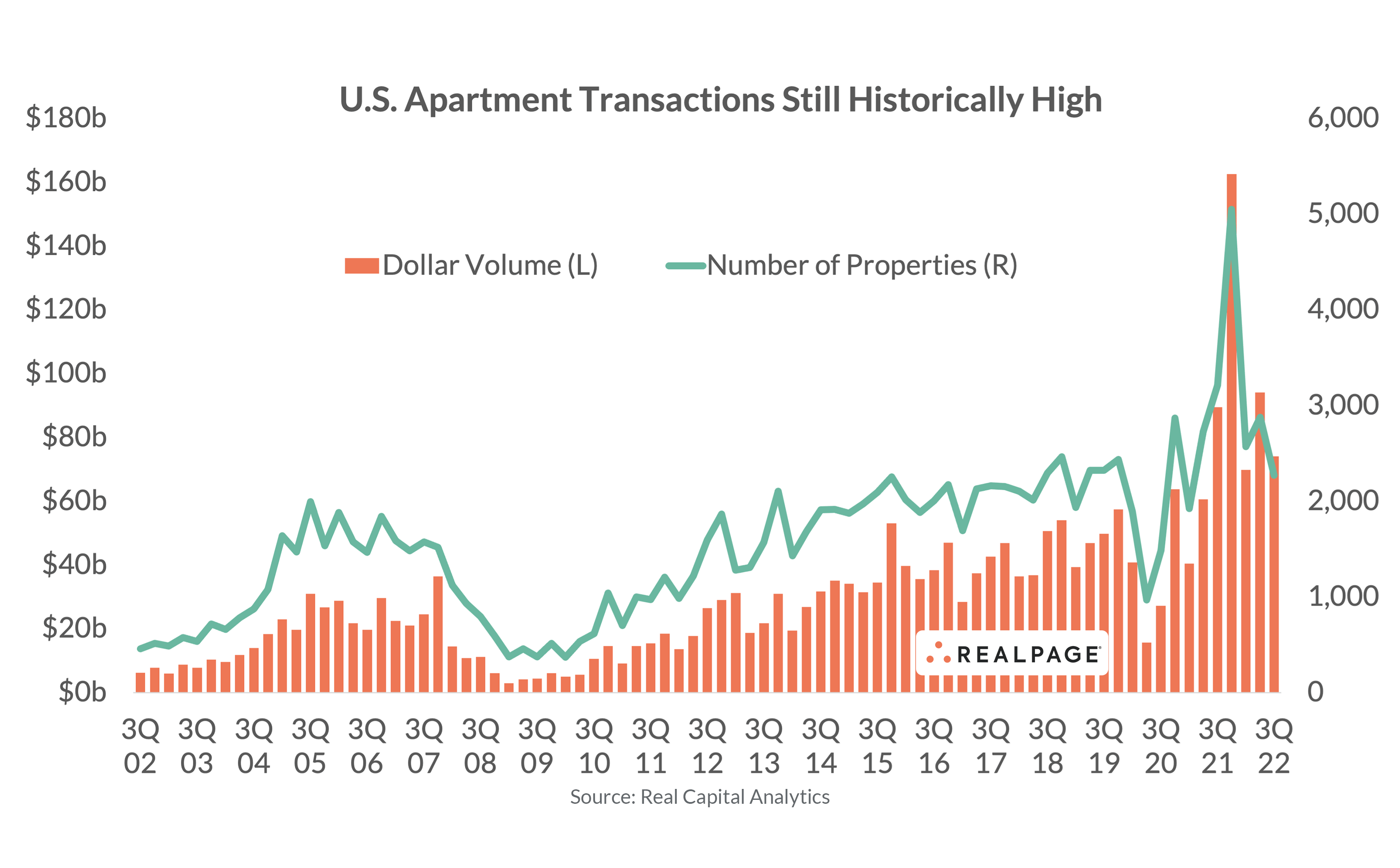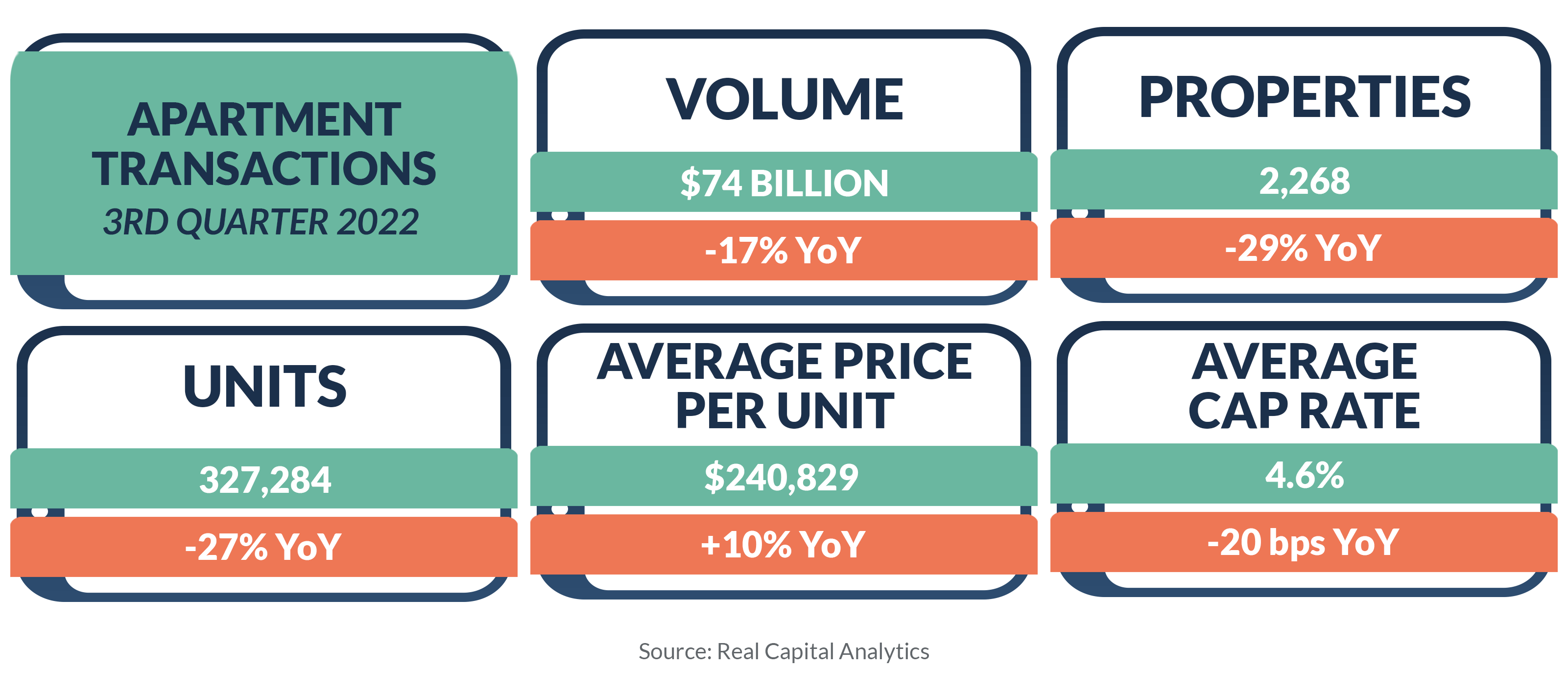 Roughly 2,300 apartment properties changed hands at a value of nearly $74.1 billion during 3rd quarter 2022, according to Real Capital Analytics (RCA). Overall sales volumes during the quarter were down 17% year-over-year and were well below 4th quarter 2021 levels when around 5,000 properties changed hands for nearly $162.6 billion, the result of pent-up demand following the onset of the pandemic. But recent activity is still well above the $57.8 billion quarterly average over the past five years.