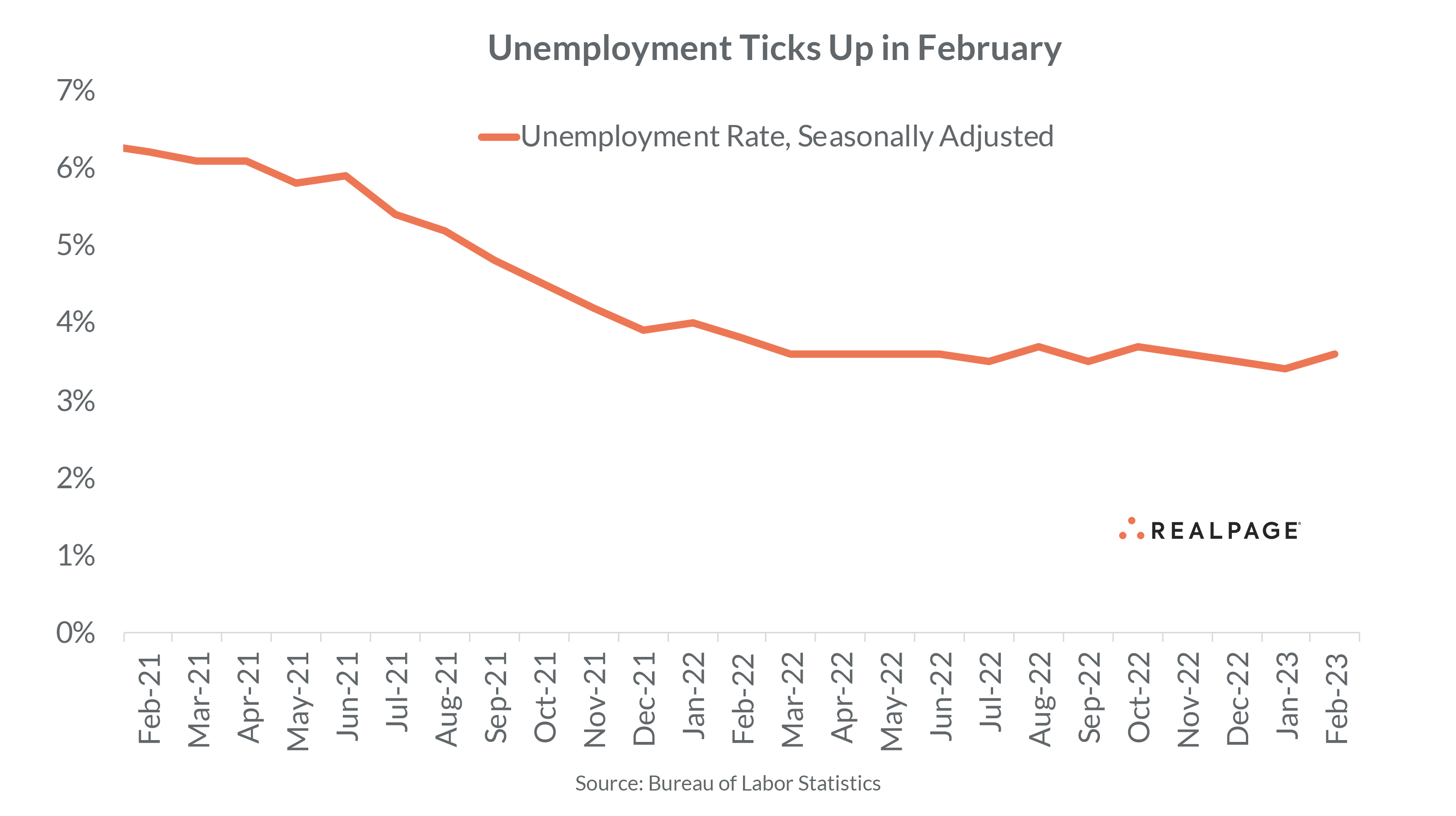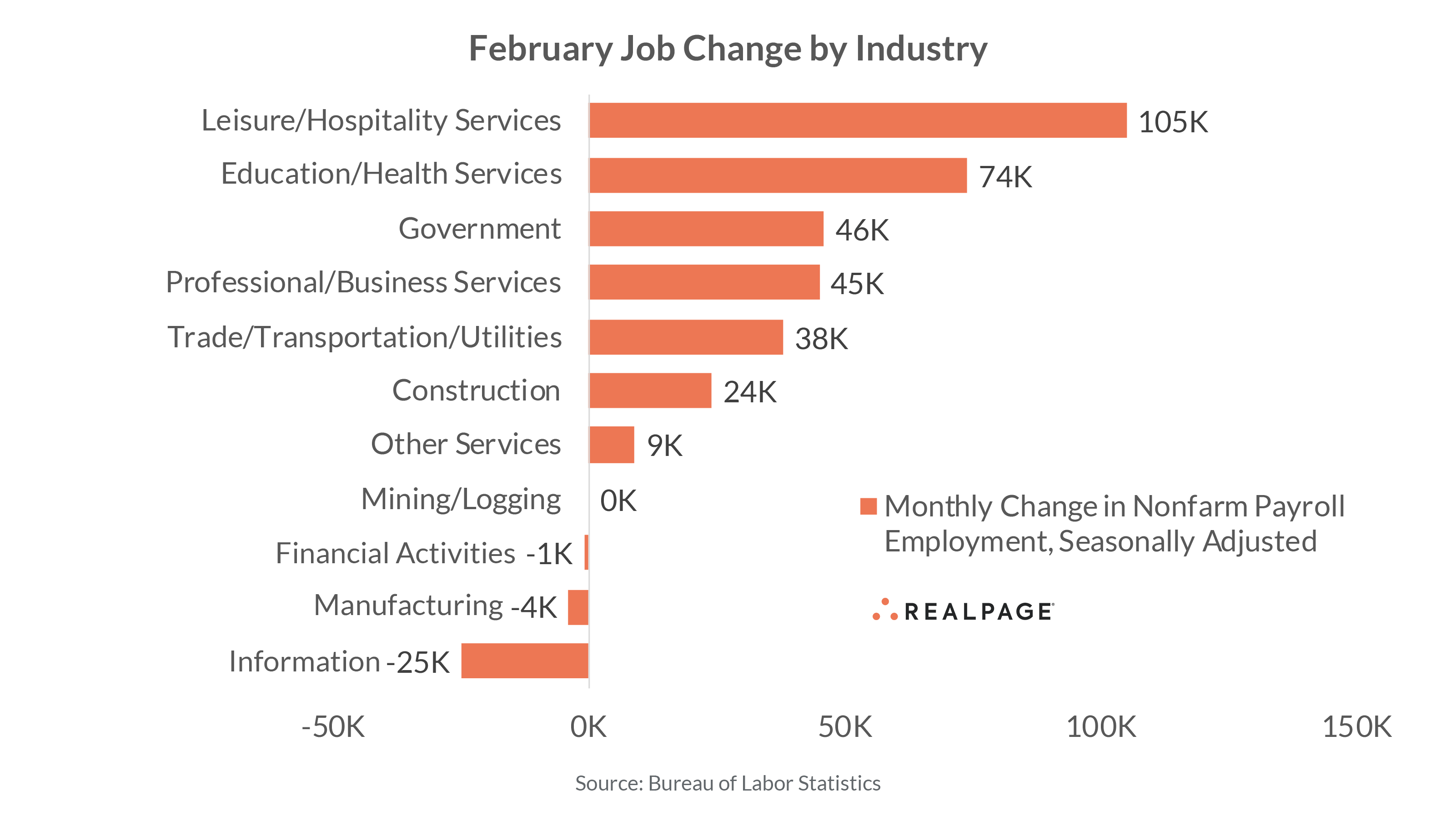 Job growth in February was most notable in Leisure and Hospitality Services and Education and Health Services. On the other hand, employment declined in Information, Manufacturing and Financial Activities.