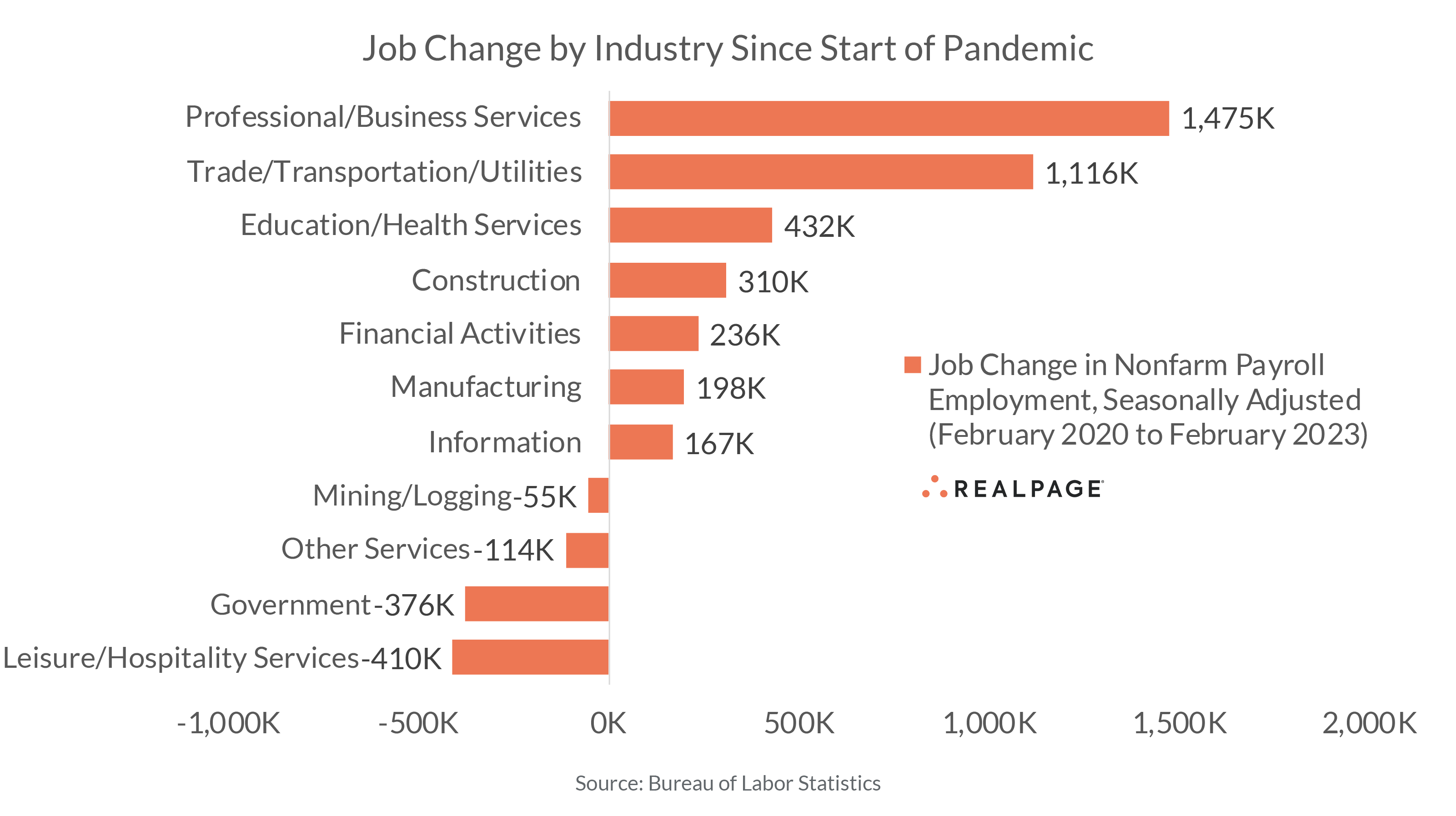 The U.S. economy has recovered all the net jobs lost during the COVID-19 pandemic. As of February, the nation had nearly 3 million more jobs (+2%) compared to the pre-pandemic employment level from February 2020.