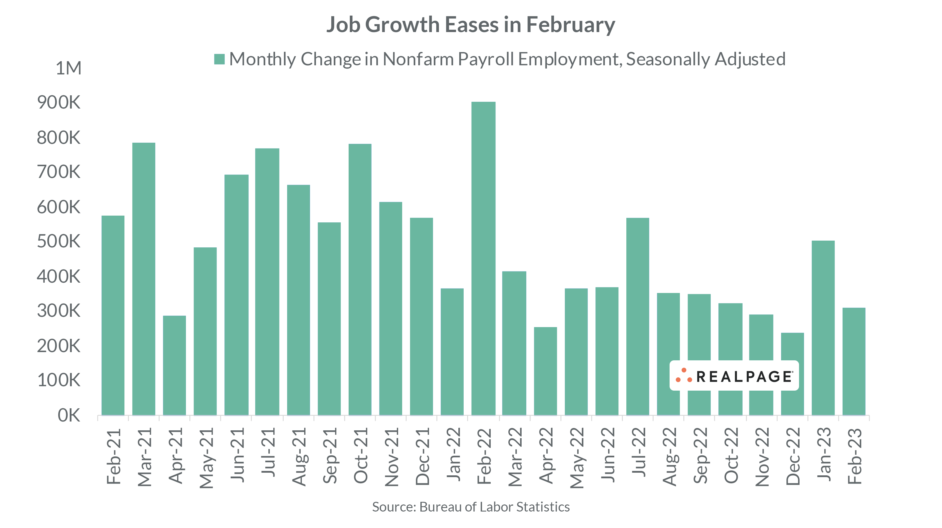 Roughly 311,000 employees were added to payrolls in February 2023, according to the Bureau of Labor Statistics (BLS). That was a better result than the roughly 225,000 jobs economists projected for the month, but well below January’s gain of 504,000 jobs. In addition, recent job gains were below the monthly average of around 399,000 jobs added in 2022, but well above the average of roughly 190,000 jobs added each month prior to the pandemic from 2015 to 2019.