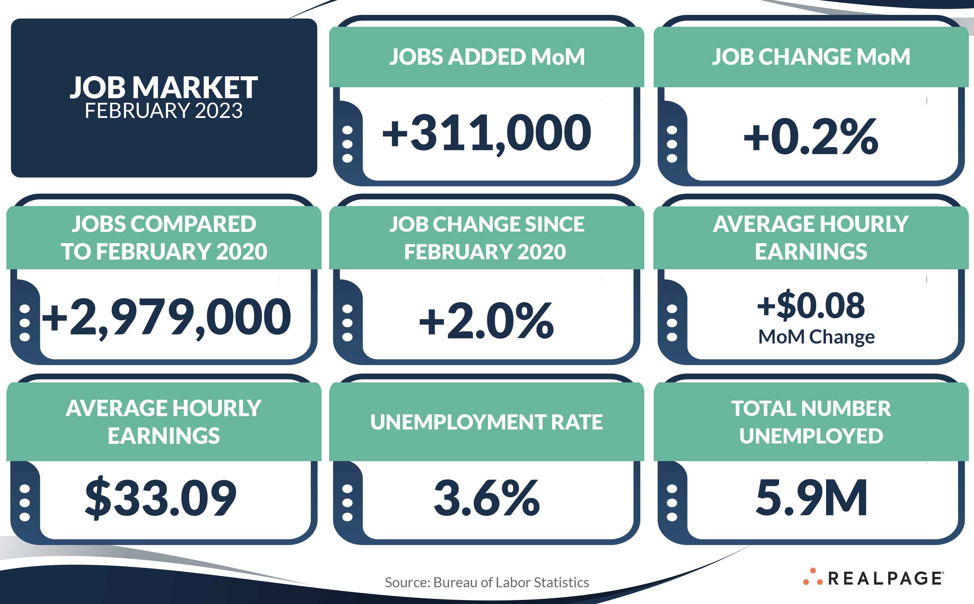 Average hourly earnings among employees on private nonfarm payrolls rose $0.08 (+0.2%) from January to February. That monthly increase took average hourly earnings to $33.09 in February. On an annual basis, average hourly earnings were up $1.46, a 4.6% increase year-over-year. However, wages were outstripped by inflation, as the Consumer Price Index (CPI) rose 6.4% in the year-ending January.