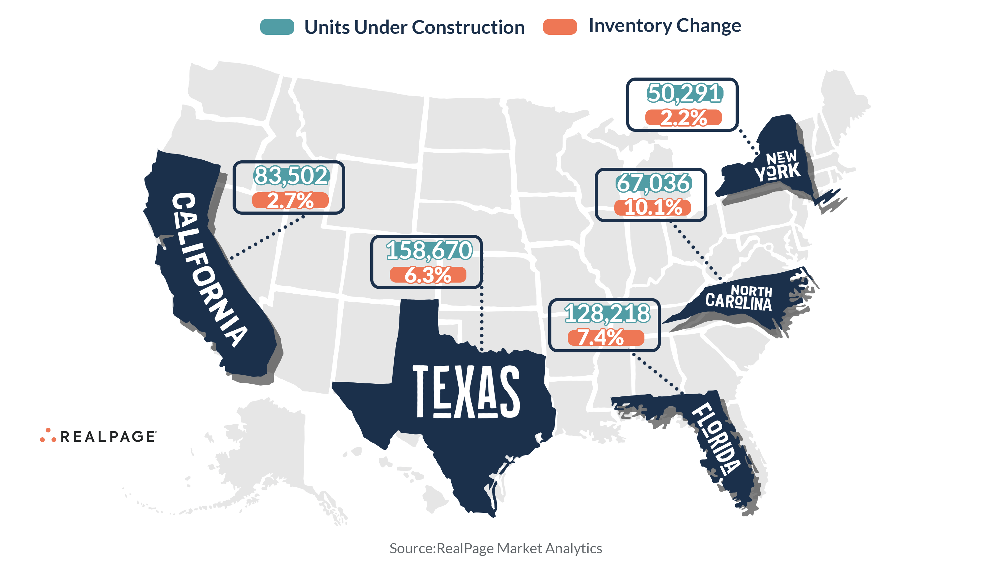 While apartment construction activity is up almost everywhere nationwide, five states are building nearly half the nation’s total volume of supply.