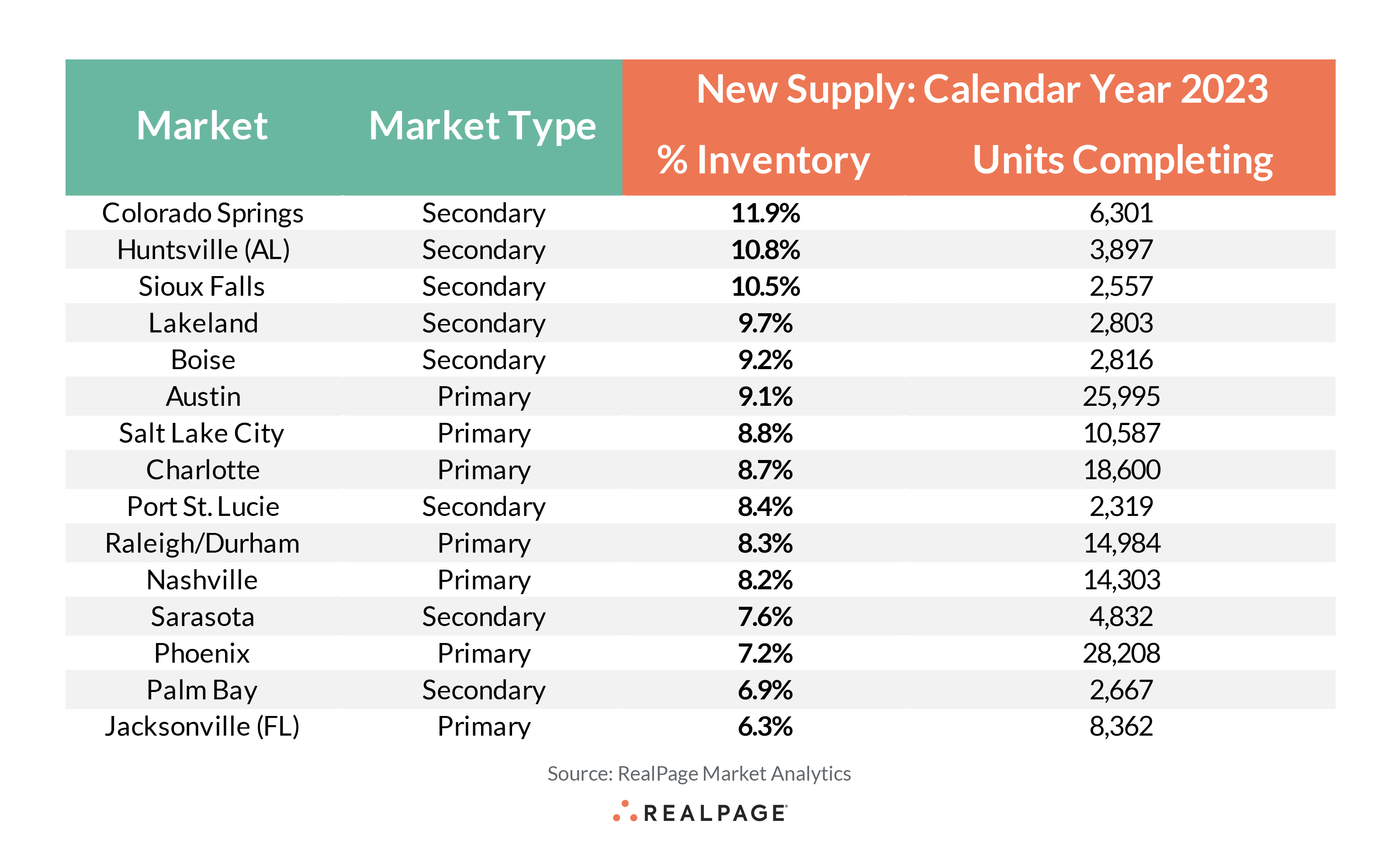 In all fairness, Boise is the most drastic example of red flag inventory growth. And being a secondary market with a smaller existing unit total means performance volatility can run higher than the bigger primary markets.