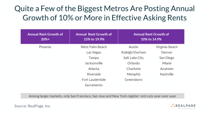 Annual growth in effective asking rents comes in at more than 10% in 65 of the country’s 150 largest metros, including 22 spots where year-over-year price increases are at 15% or more.