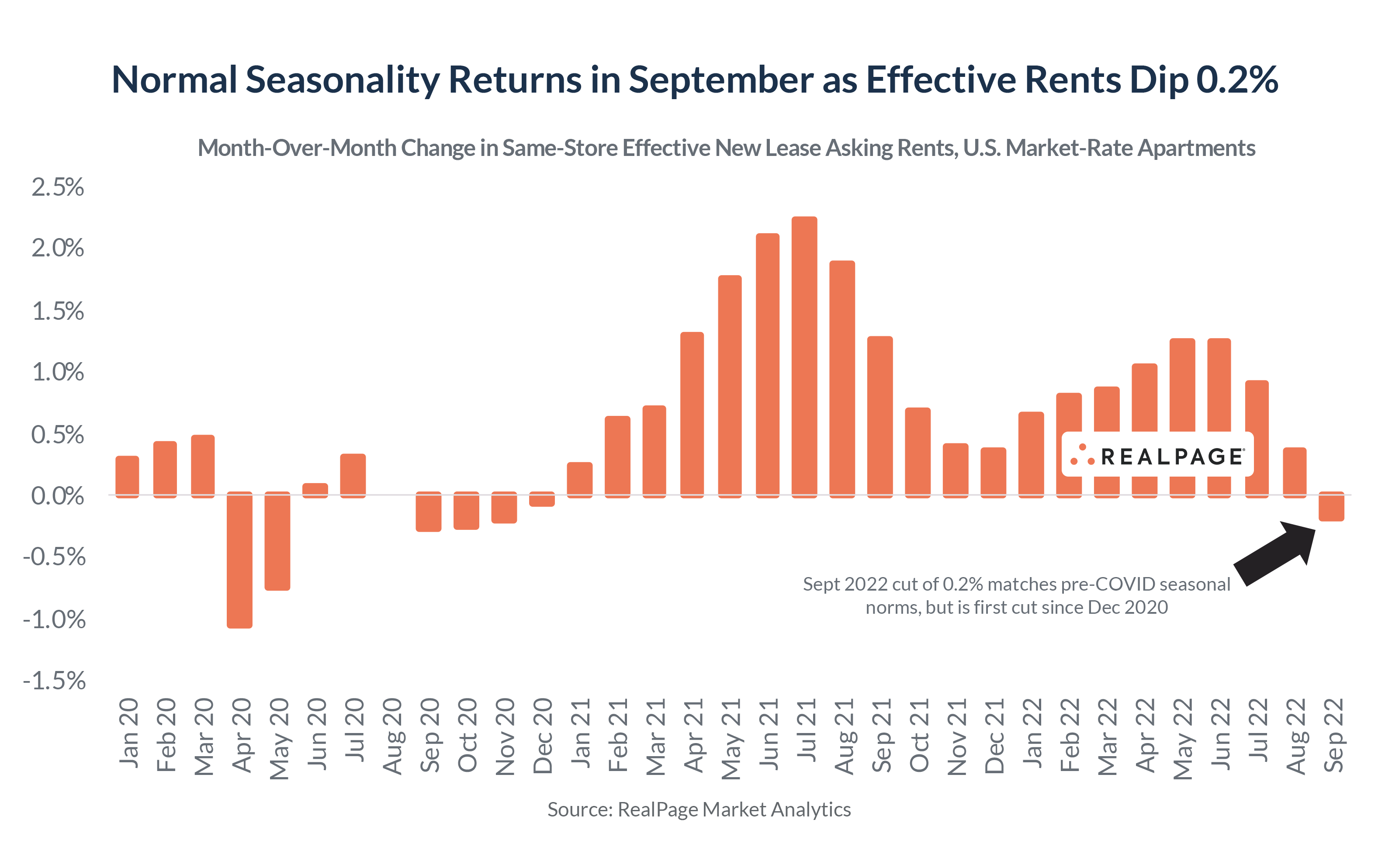 Recent rent movements track with the rise and fall of apartment demand. Month-over-month changes in effective asking rent so far in 2022 have registered well below 2021 every month since April. That’s cooled year-over-year rent growth from a peak of 15.7% in March to 9.0% in September, the first single-digit number since summer 2021.