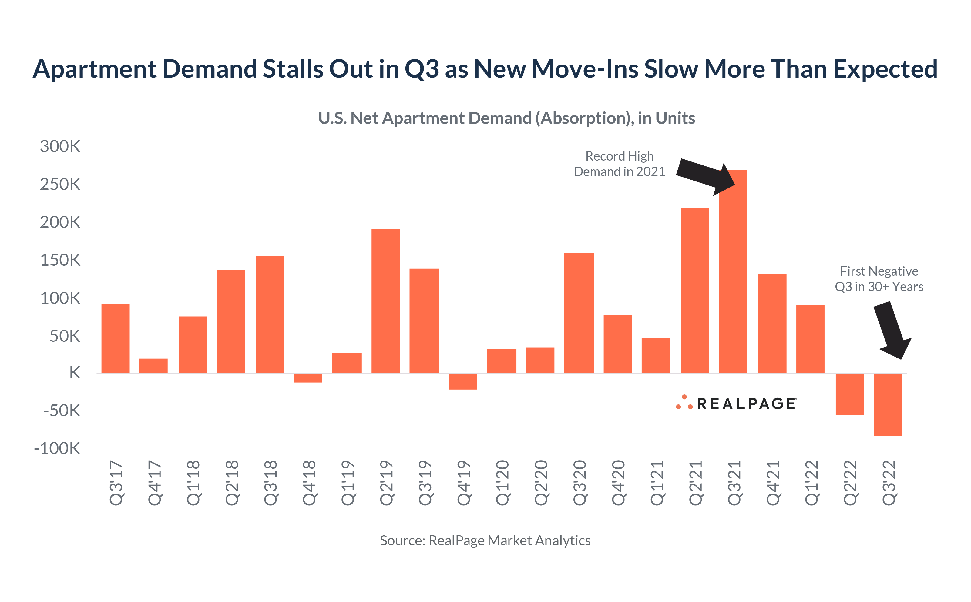 A surprisingly big slowdown in leasing traffic pushed net apartment demand moderately negative in 3rd quarter at -82,095 units – typically a seasonally strong leasing period. It also marked the first time in RealPage’s 30 years of tracking U.S. apartments that demand registered negative during a 3rd quarter period.