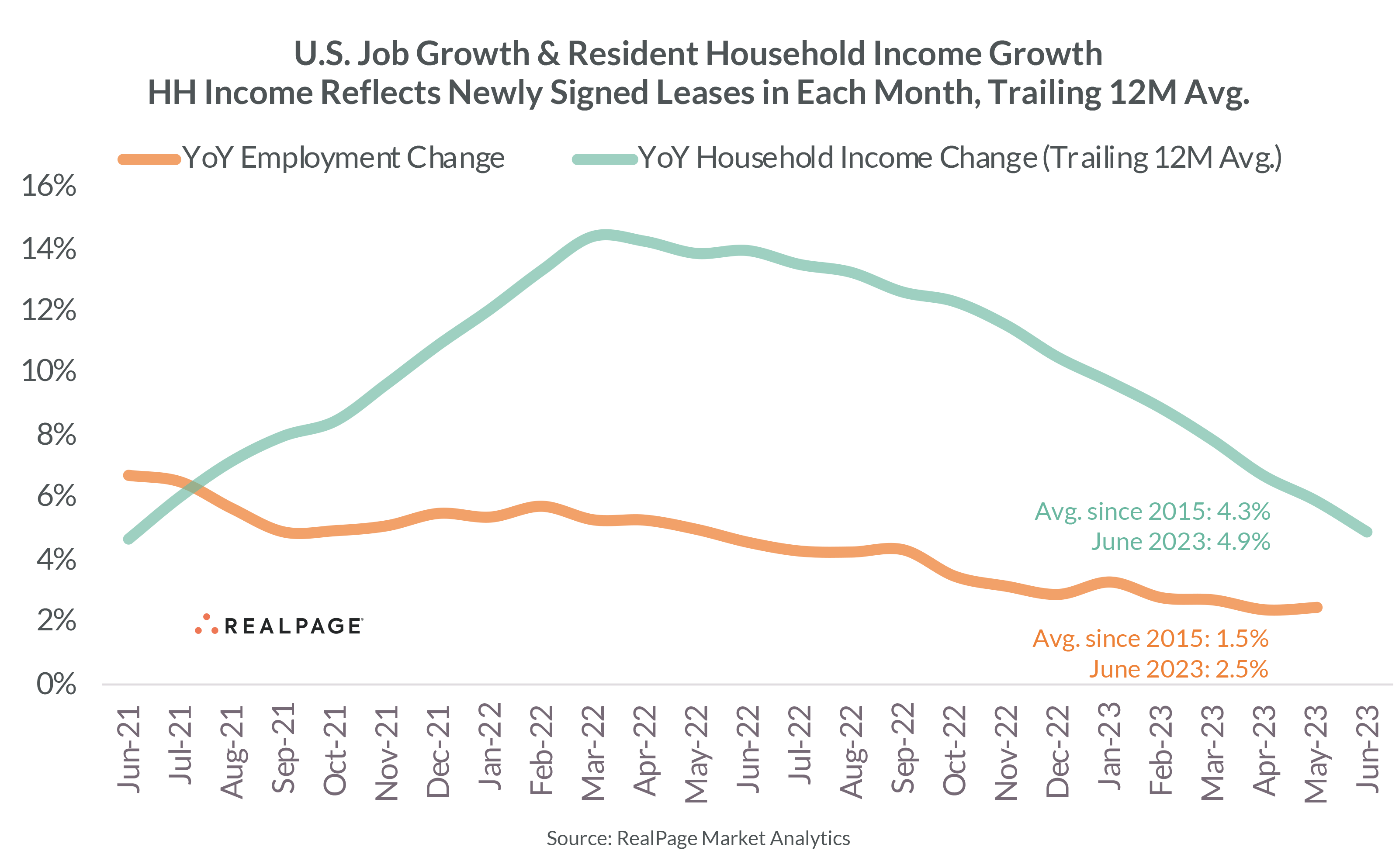 In the first half of 2023, some of that pent-up apartment demand finally showed up, despite job and income growth easing from former highs.
