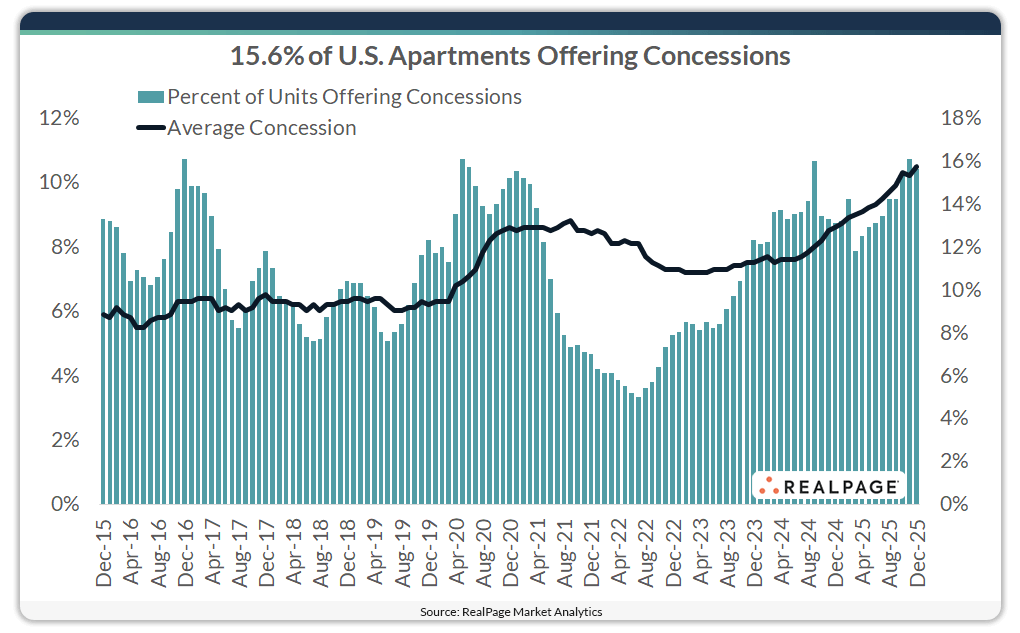 Following typical seasonal patterns, U.S. apartment concessions in December remained relatively unchanged from November’s performance, as operators sought to capture prospective renters during a busy and distraction-heavy time of year. December often brings stable or slightly elevated concession activity due to cold weather, holiday travel and generally fewer household moves. Nationwide, 15.6% of stabilized apartments offered concessions in December, according to data from RealPage Market Analytics. This marks the highest December usage rate since December 2016, when concessions usage reached 16.1%. The average December discount of 10.5% held essentially steady with October and November, both of which hovered around 10%. The October through December average sits at the highest discount depth since the post–Great Financial Crisis period (2010) and reflects ongoing efforts to absorb the elevated wave of new supply concentrated across the Sun Belt region. By product class, Class A units posted the deepest concession discount at 11.0%, followed closely by Class B (10.2%) and Class C (10.5%) units. However, Class C properties continued to show the highest usage, with 19.1% offering a discount in December. Concession usage in Class A and B stock was comparatively milder at roughly 13% to 14%. Still, all three product classes saw concession usage tick down very slightly (by generally less than one point) from November, which was effectively the monthly high for 2025.