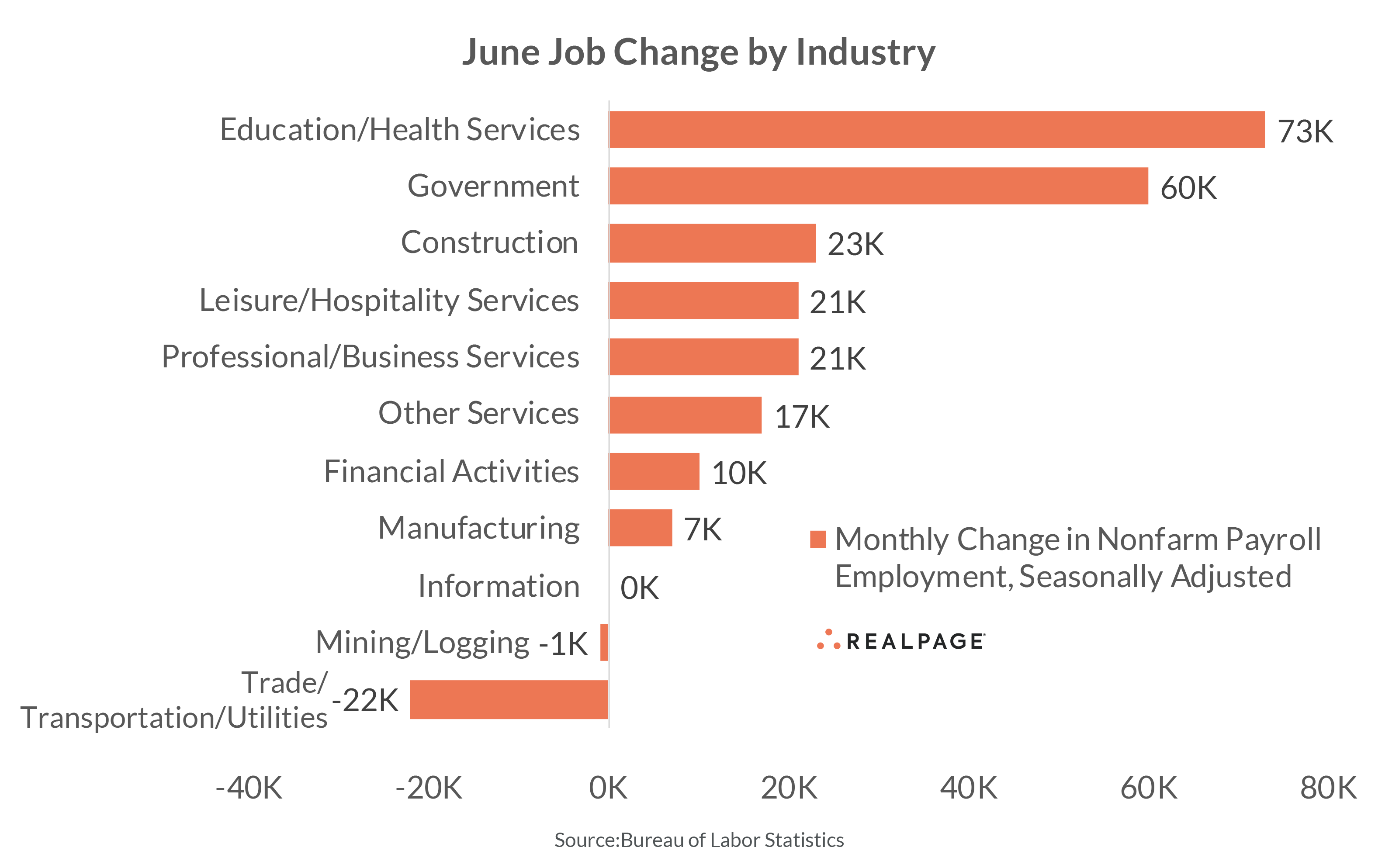Job growth in June was seen across most major industry sectors, but most notably in the Education and Health Services (+73,000 jobs) and Government (+60,000 jobs) sectors. Solid gains were also recorded in Construction (+23,000 jobs), Leisure and Hospitality Services (+21,000 jobs) and Professional and Business Services (+21,000 jobs). The only two industries to record job losses in June were Trade, Transportation and Utilities (-22,000 jobs) and Mining and Logging (-1,000 jobs).