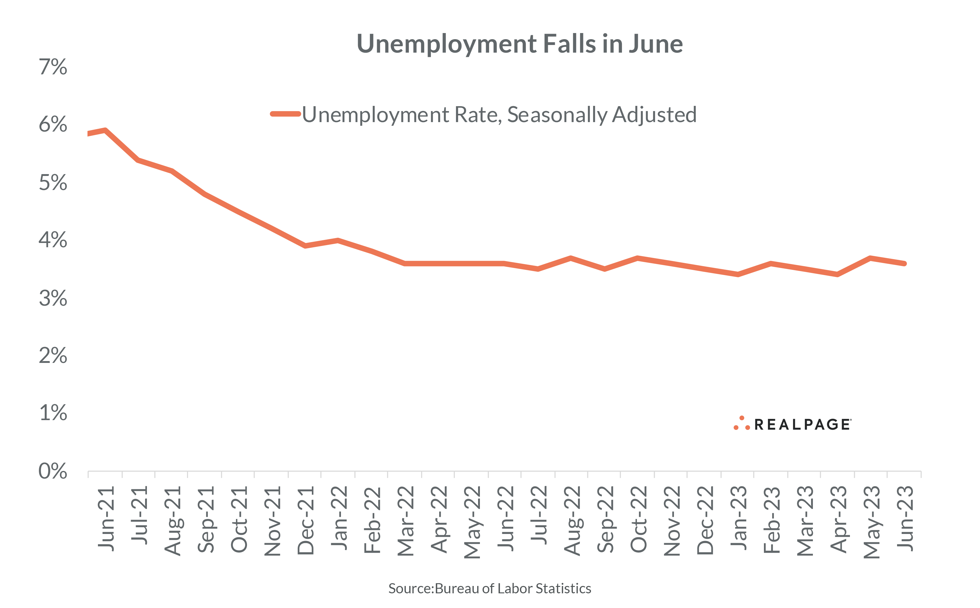 The unemployment rate (U3 or headline unemployment rate which is seasonally adjusted) in June clocked in at 3.6%, down from the 3.7% rate in May. Since March 2022, the unemployment rate has been in a narrow range of 3.4% to 3.7%. At the onset of the pandemic, the unemployment rate climbed to 14.7% in April 2020. Prior to the pandemic, the unemployment rate clocked in at 3.5% to 5.7% from 2015 to 2019, averaging 4.4% during that period.