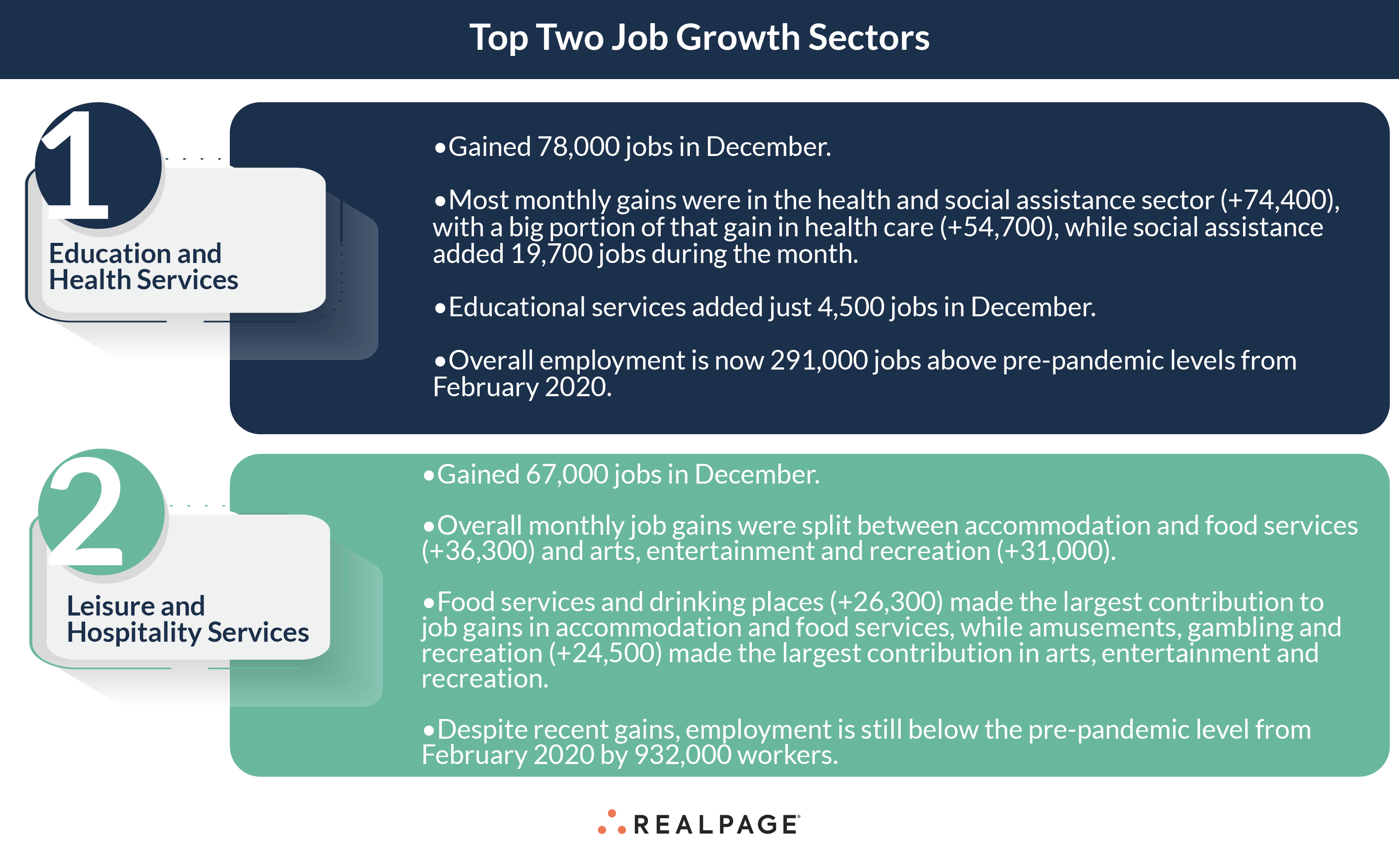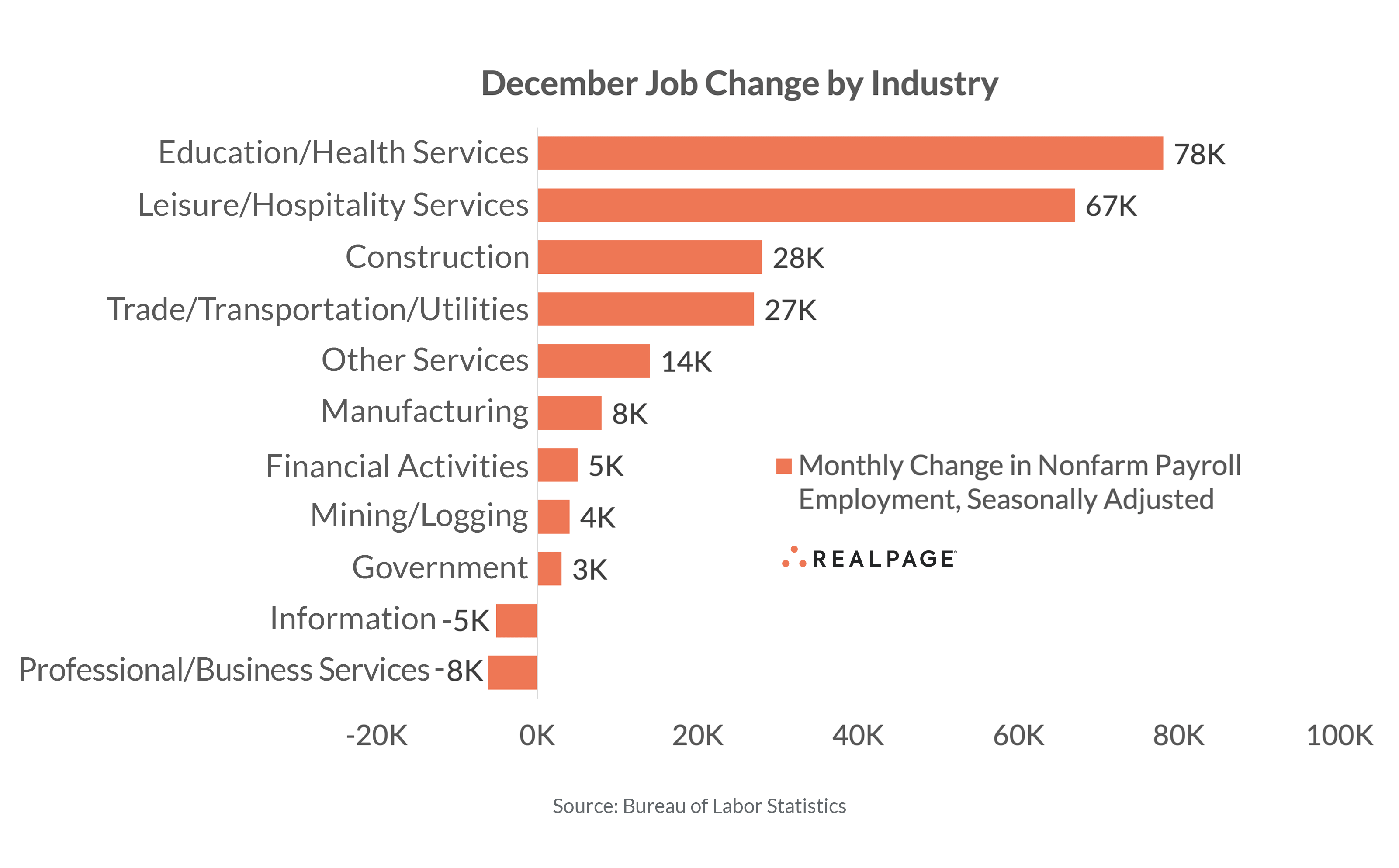 Most major employment sectors gained jobs in December. The biggest monthly job gains occurred in Education and Health Services and Leisure and Hospitality Services. Professional and Business Services and Information were the only major industries to record job losses during the month.
