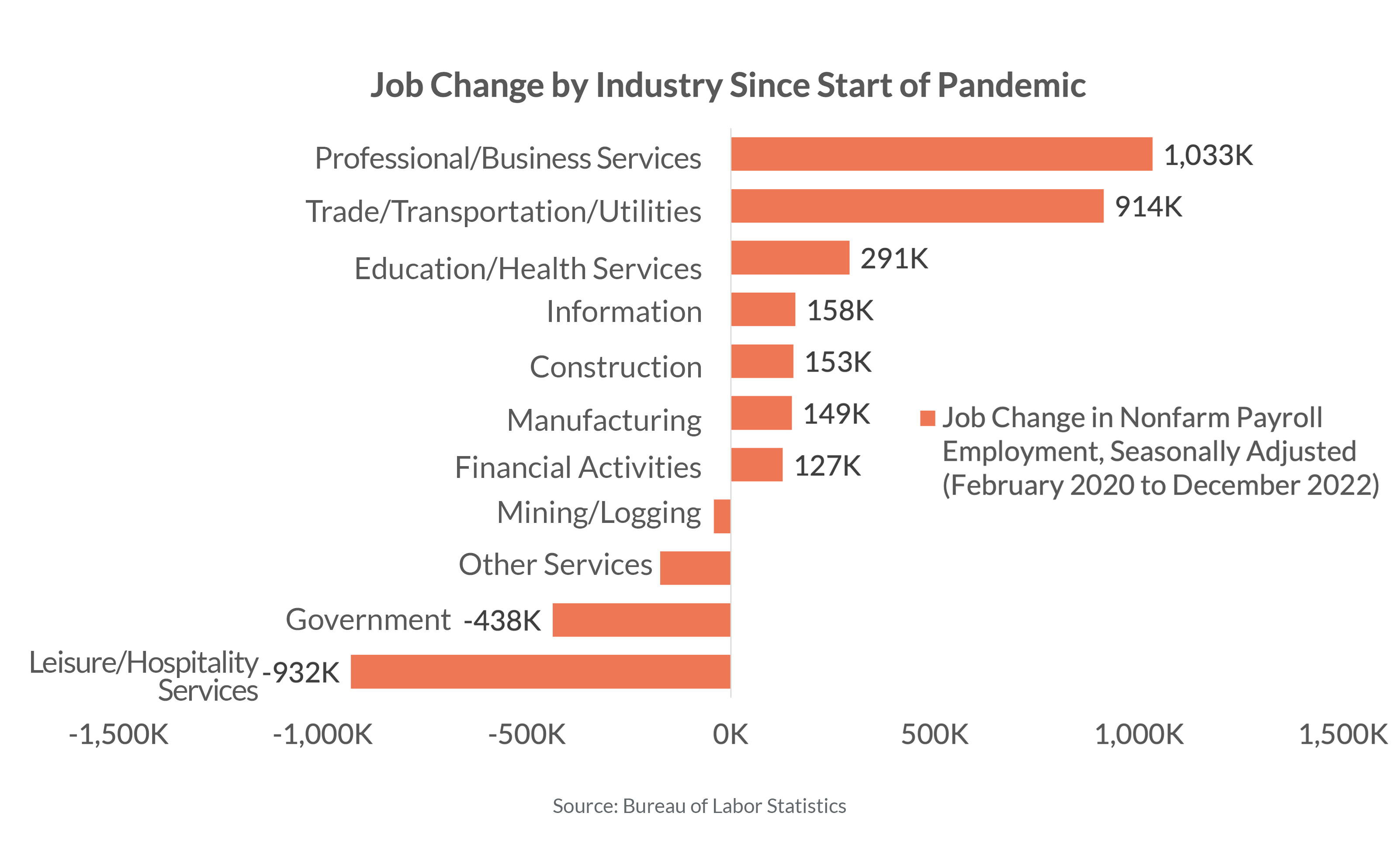 Most job sectors have recovered all the jobs lost during the COVID-19 pandemic downturn. Professional and Business Services has seen the best recovery, with today’s job count coming in over 1 million positions ahead of February 2020 numbers. Trade, Transportation and Utilities is also well ahead of pre-pandemic norms, with employment up by 914,000 jobs.