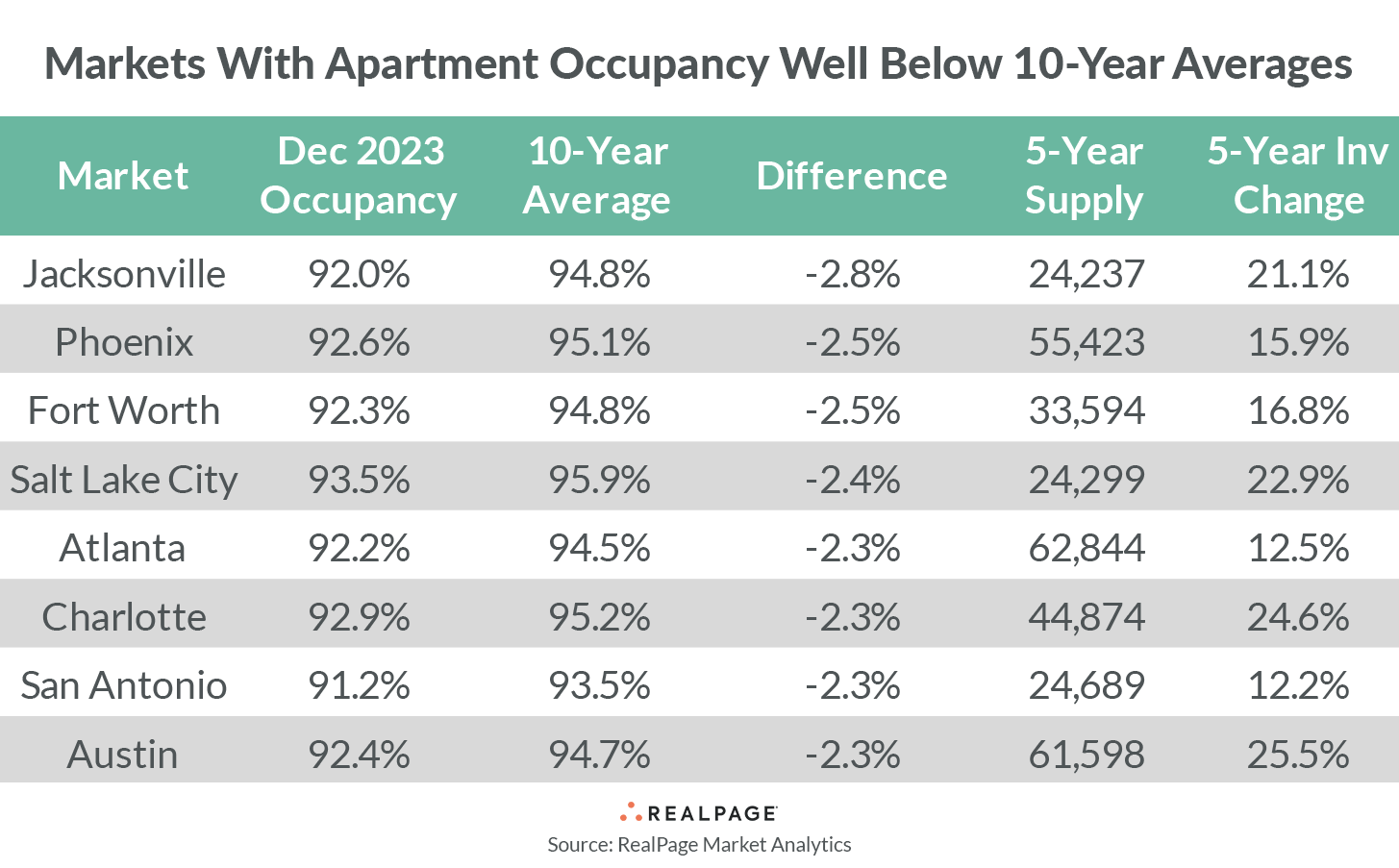 Most of the largest 50 apartment markets, on the other hand, logged occupancy behind their 10-year averages. And supply has been the clear culprit in these markets.