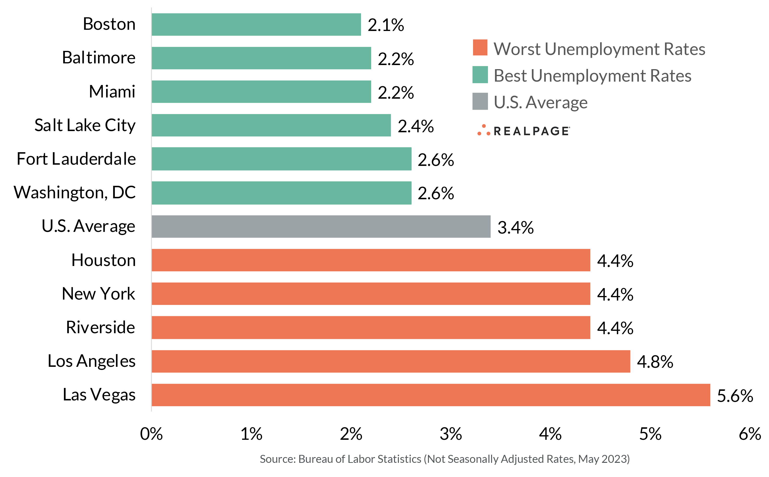 Unemployment across the U.S. continues to register at historically low levels thanks to an improved job market. As of May, the nation’s unemployment rate averaged 3.4%, according to non-seasonally adjusted data from the Bureau of Labor Statistics. While that was up from 3.1% in April, it was unchanged year-over-year and marked the second consecutive month below 3.5% and the 15th consecutive month below 4%. For comparison, during the two years leading up to the COVID-19 pandemic (2018-2019), unemployment registered between 3.3% and 4.5%, averaging 3.8% nationally. Prior to that period, unemployment hadn’t fallen below 3.5% since the late 1960s. Among the nation’s 50 largest markets, Boston recorded the lowest unemployment rate in May at 2.1%, followed by Baltimore and Miami, both at 2.2%. Those three markets even edged out Salt Lake City (2.4%), which prior to the pandemic, typically had the lowest unemployment rate nationally. On the flip side, Las Vegas posted the highest unemployment rate in May, at 5.6%. The next worst performer was Los Angeles, with unemployment at 4.8%. Unemployment rates in May were lower than a year ago in 20 of the nation’s largest markets, higher in 24 and unchanged in six. The most improved unemployment rates in May were seen in Boston and Cleveland, with both posting year-over-year declines of 110 basis points. The weakest performances were in San Jose and Riverside, where unemployment rose around 100 basis points over the past year.