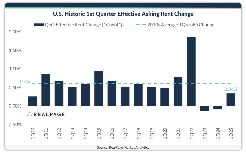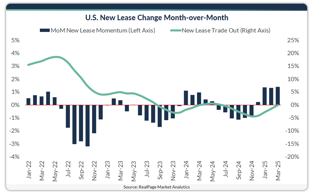 The month-over-month change in new lease trade-out ranked consistently around 1.4% in January, Febraury and March. While this time frame historically is a strong one for the U.S. apartment market, early 2025’s momentum was the strongest in at least three years.