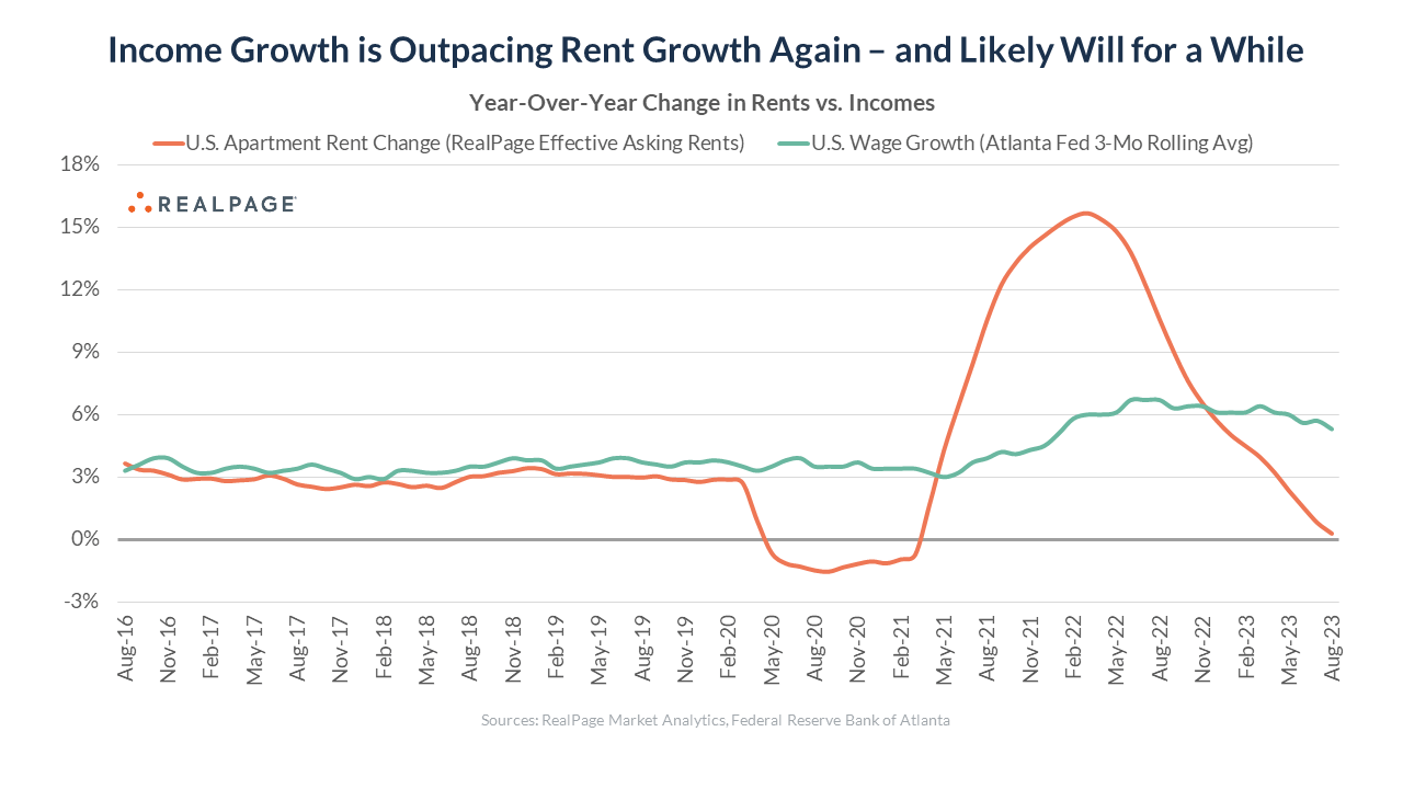 Year-over-year U.S. wage growth has topped effective apartment rent growth for nine consecutive months. Through August 2023, wages topped rents 5.3% to 0.3%. The income data comes from the Federal Reserve Bank of Atlanta’s Wage Growth Tracker, while the rent data reflects effective asking rents for market-rate apartments tracked by RealPage.