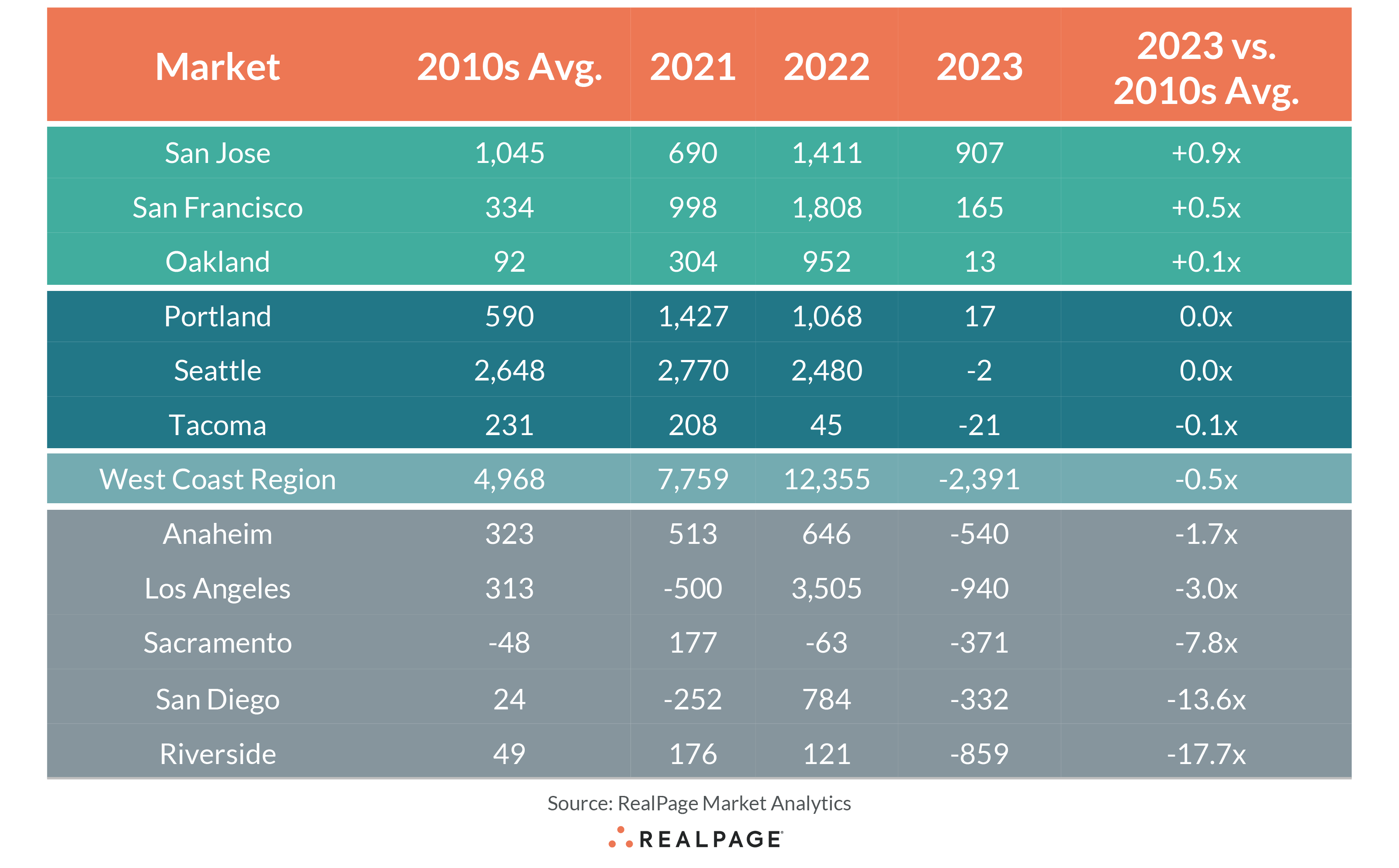 While U.S. apartment demand finally turned a corner in 1st quarter, the West Coast region specifically didn’t see as much improvement as the nation overall. Within the West Coast, the Bay Area fared the best, with San Jose logging demand for over 900 units in 1st quarter 2023. San Francisco also registered demand for over 100 units in 1st quarter, while Oakland absorption was negligible. While the Bay Area outperformed relative to regional peers, however, demand here failed to match up to typical 1st quarter absorption patterns. Pacific Northwest markets Portland, Seattle and Tacoma logged essentially no apartment demand in 1st quarter, a particularly disappointing figure for Seattle, where demand typically averages around the 2,000-unit mark in the first three months of the year. Southern California markets dramatically underperformed normal trends, with Los Angeles and Riverside logging negative demand for about 900 units each.