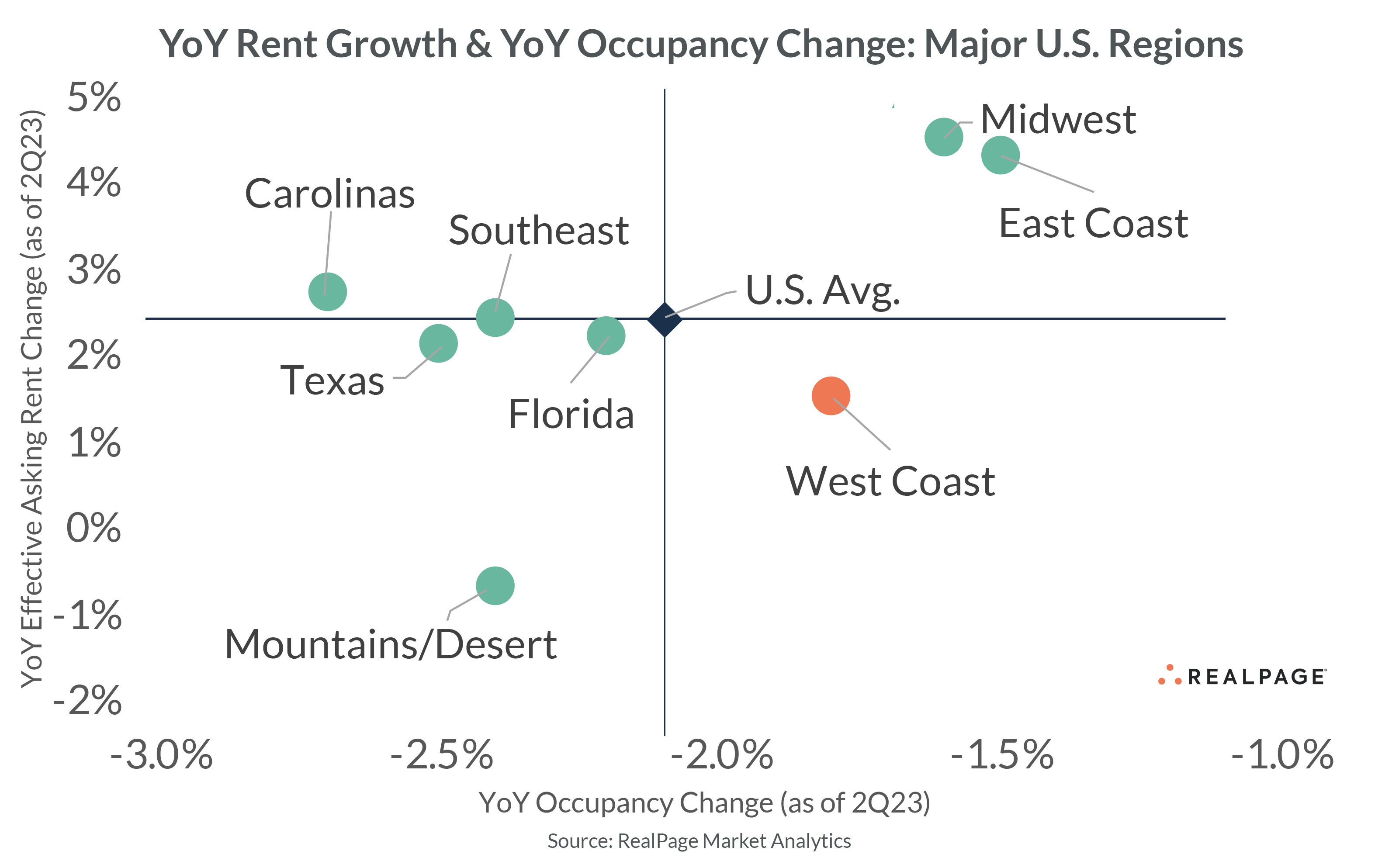The West Coast is the only region across the U.S. where apartment occupancy is not falling as quickly as the national norm but, at the same time, is seeing weaker-than average rent growth. In the year-ending 2nd quarter, rents in West region markets were growing at roughly half of the rate seen in the nation overall. And West Coast rent growth is not just underperforming national norms; it’s also behind long-term regional trends. This pricing disappointment is happening despite occupancy in the West Coast falling far less rapidly than in most other regions. The only regional peers that are seeing less pronounced occupancy decline are the Midwest and East Coast. In each of those areas, however, annual rent growth is significantly stronger. Two standout market-level performances in the West Coast are San Diego and San Jose, where rent growth remains ahead of the national norm. In fact, San Diego ranks among the nation’s strongest markets for annual rent growth in 2nd quarter.