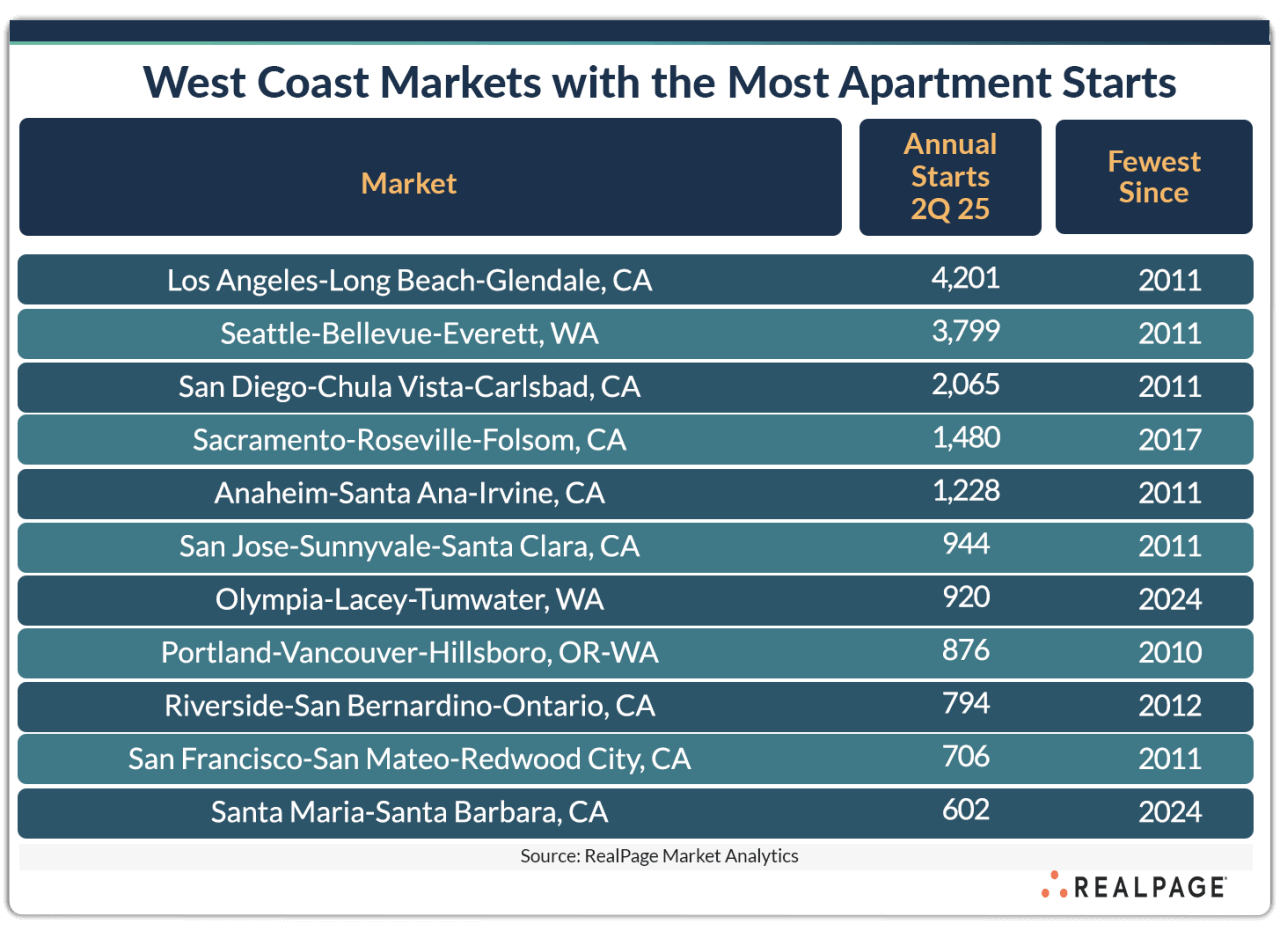 Multifamily starts have declined sharply across the West Coast’s major apartment markets in recent years. Just 20,000 market-rate units started in the year-ending 2nd quarter across the West Coast, which was the lowest number the region has seen since 2011. In big West Coast markets like Los Angeles, Seatle, San Diego, Orange County and San Jose, starts sit at their lowest point since 2011. In Portland, fewer units started in the past year than the market has seen since 2010. Starts activity was the most prominent in Los Angeles, with about 4,200 starts in the year-ending 2nd quarter. Seattle saw less than 4,000 units kick off in the past year. San Diego rounded out the top three along the West Coast, with starts of a little more than 2,000 units in the past four quarters.