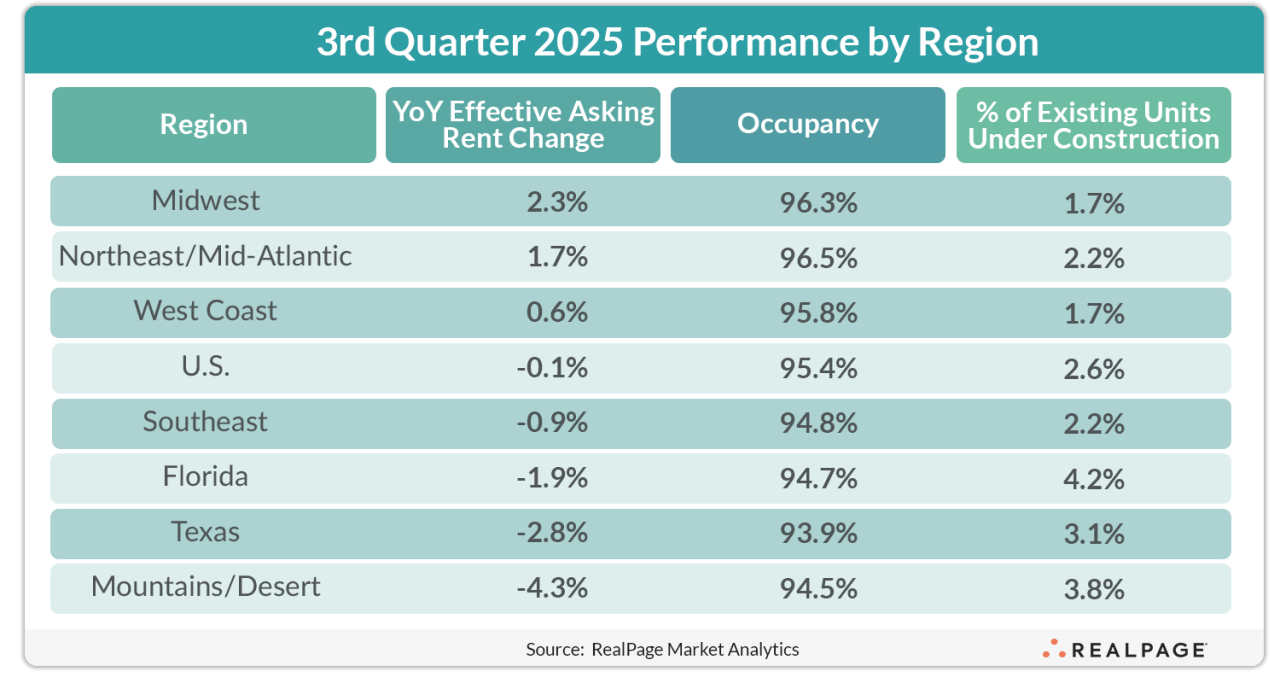The nation’s West Coast apartment markets in general saw better rent growth and occupancy performance than most other regions recently. The West Coast led the nation for rent growth in 3rd quarter, with prices climbing 0.2% during the July to September time frame. Annually, rents were up 0.6%, compared to an average rent cut of 0.1% on the national level. Inspiring rent growth, occupancy across West Coast markets averaged 95.8% in 3rd quarter, also ahead of the U.S. norm of 95.4%. In fact, only two West Coast markets – Fresno and Salinas – saw occupancy decline over the past year. Despite those setbacks, occupancy rates in those two markets remained above the 96% mark. While demand has been moderate in the West Coast region, inventory growth here has been pacing well behind the U.S. average. Looking ahead, apartments under construction in the U.S. are expected to grow the national existing base by 2.6%, while the West Coast is scheduled to add another 1.7% to inventory.