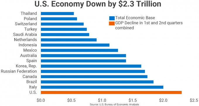 To put things further in perspective, that $2.3 trillion loss in just two quarters is larger than the total dollar value of several countries. The below chart compiles a list of 15 countries around the world, with economies similar to or smaller than the $2.3 trillion loss the U.S. has seen in 2020. While the composition of each economy is different from that of the U.S., comparing them to the total U.S. loss helps us to better understand the magnitude of what the nation has endured in 2020.