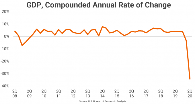 The last time the U.S. economy recorded an economic contraction was in 2nd quarter 2009, when the GDP shrunk by 1.2%, preceded by declines of 4.5% and 7.2% in the previous two quarters. Prior to 2nd quarter 2020, the largest GDP drop in U.S. history was recorded in 1st quarter of 1949 when the economy shrank by 7.4%. With the most recent numbers diving by more than four times that pace, it’s clear the current recession will be felt in the months and years to come.