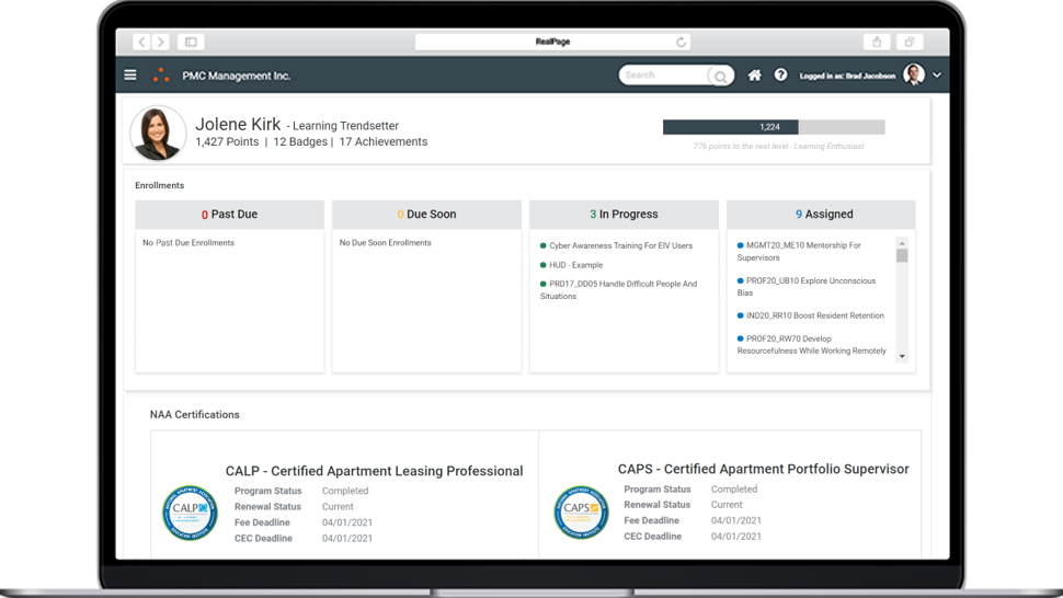 Christi Weinstein, VP Support Operations, with BH Management Services, stated, “The partnership between RealPage EasyLMS® and NAAEI enables our employees to easily manage and maintain their NAA Industry Credentials which helps ensure our teams stay current and active within our industry. With our ability to quickly run reports and gain insights on the status of our employees’ credentials, we’re now able to help support them in their efforts to keep their credentials current. With no additional cost associated with this feature, it creates a high impact and value-add for BH Management team members – a win-win!”
